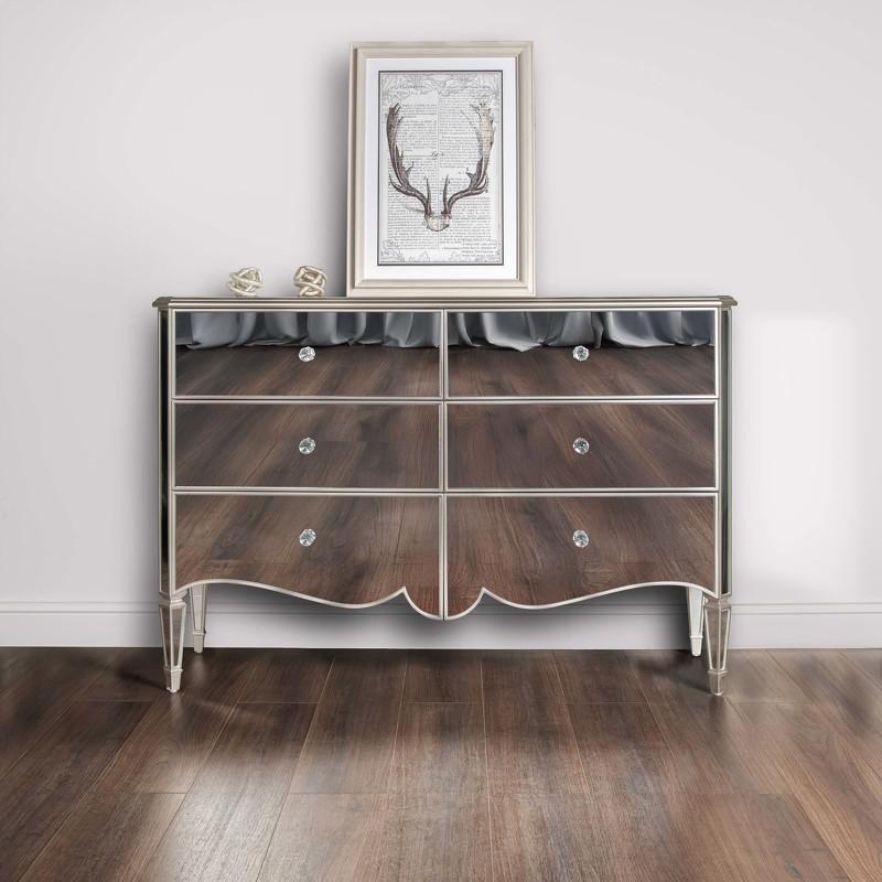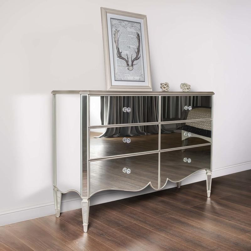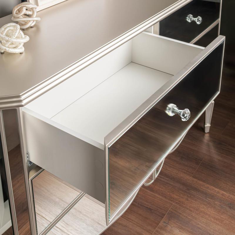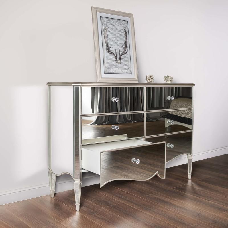 Роскошный комод от итальянского бренда Fratelli Barri с зеркальной отделкой в венецианском стиле. Классический стиль в современных материалах смотрится вне времени и всегда будет актуален. Столешница покрыта лаком, цвет - серебряное напыление. Боковые поверхности, фасады и ножки декорированы зеркалами. На ножках металлические колпачки. 6 выдвижных ящика с направляющими скрытого типа. Направляющие с доводчиками для плавного закрывания. Изготовлен из массива дерева и высококачественного МДФ. Цвет фурнитуры - хром. Корпус ящиков бежевого цвета. Данный предмет является частью коллекции Rimini. В этом дизайне есть также прикроватная тумбочка с 2-мя ящиками.