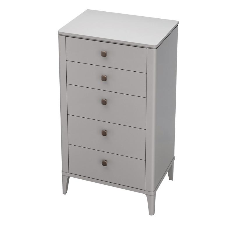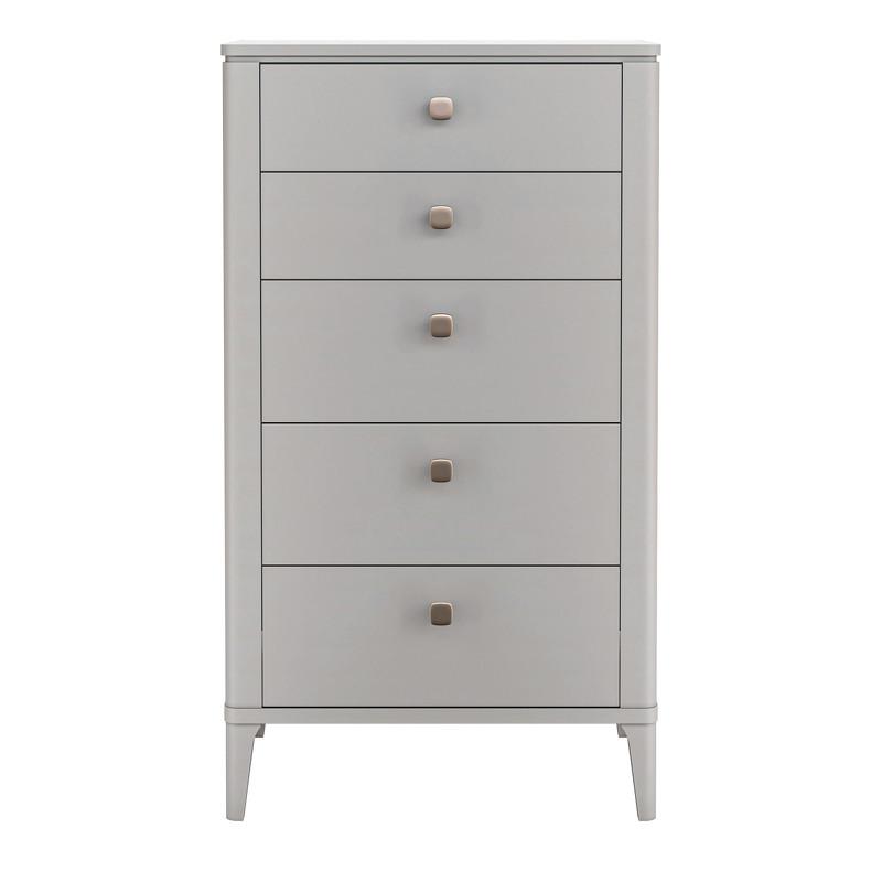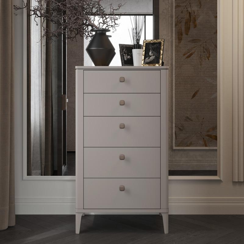 Высокий комод от итальянского бренда Fratelli Barri. Модель оснащена пятью выдвижными ящиками: два небольшой высоты и три полноценной высоты. Комод из высококачественной МДФ класса E1. Ножки массив березы. Направляющие скрытого монтажа с демпфированием soft closing. Ручки цвет бронза.