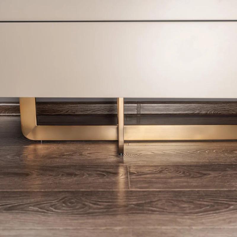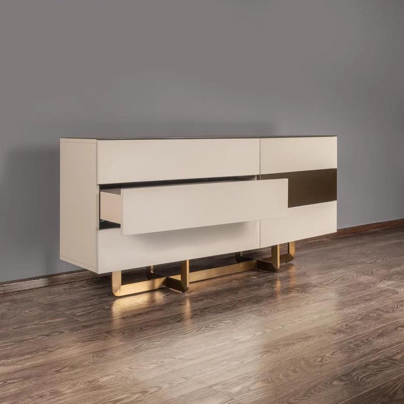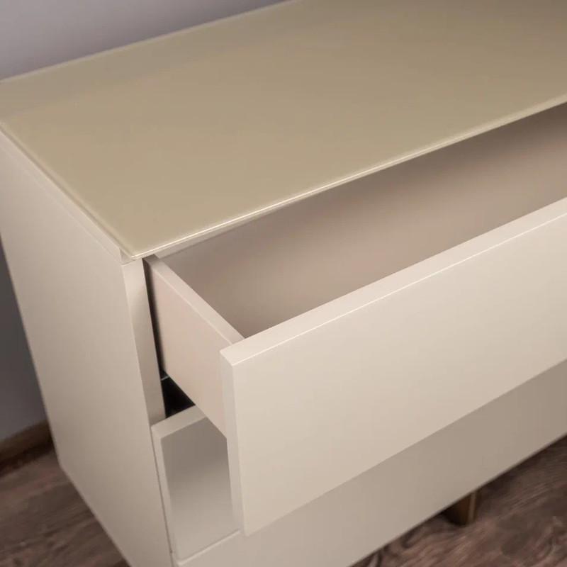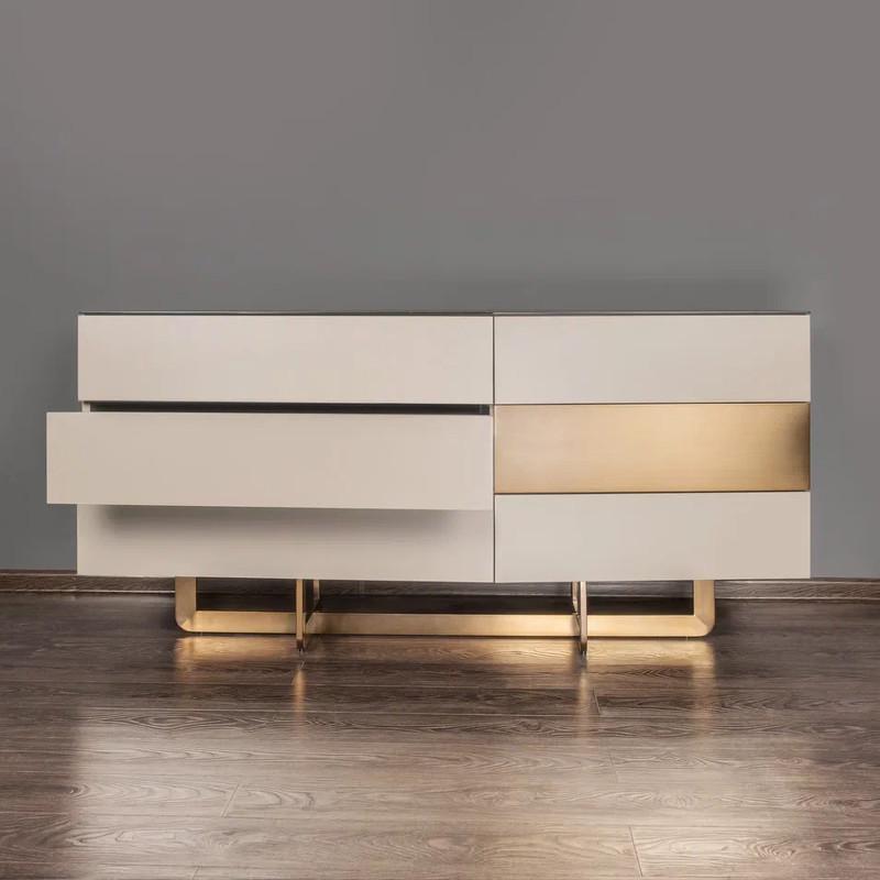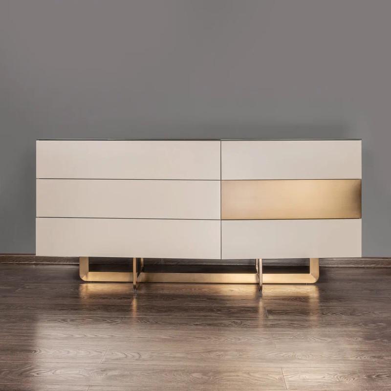 Комод от итальянского бренда Fratelli Barri оснащен шестью выдвижными ящиками, благодаря которым можно разместить все необходимое, обеспечивая удобное и доступное хранение. Ящики оснащены механизмом "push to open". Комод изготовлен из высококачественного МДФ, корпус выполнен в отделке матовым серо-бежевым лаком, ножки и фасад одного ящика выполнены из металла в цвете бронза WJ-09. Столешница выполнена из стекла.