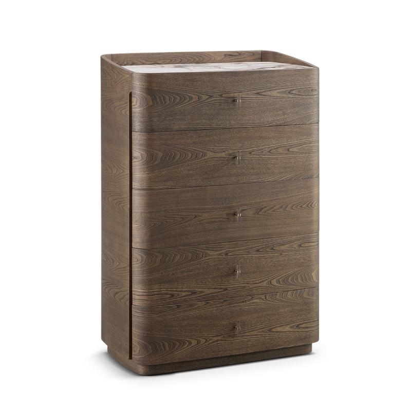 Высокий комод от итальянского бренда Fratelli Barri коллекции Belmonte. Данный комод оснащен пятью выдвижными ящиками, благодаря чему можно разместить все необходимое, обеспечивая удобное и доступное хранение. Ящики c плавным закрытием "soft close". Интересная закругленная форма комода, без острых углов, делает его атравматичным. Бортики по периметру керамической столешницы не дадут упасть мелким предметам. Основная отделка корпуса - натуральный шпон вяза.