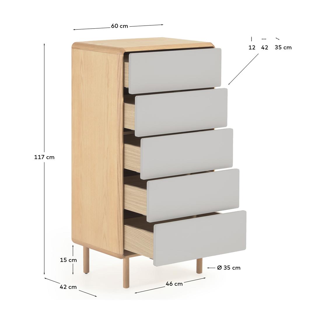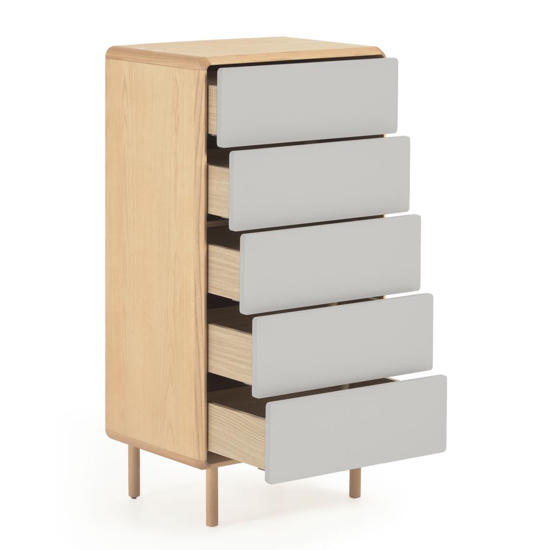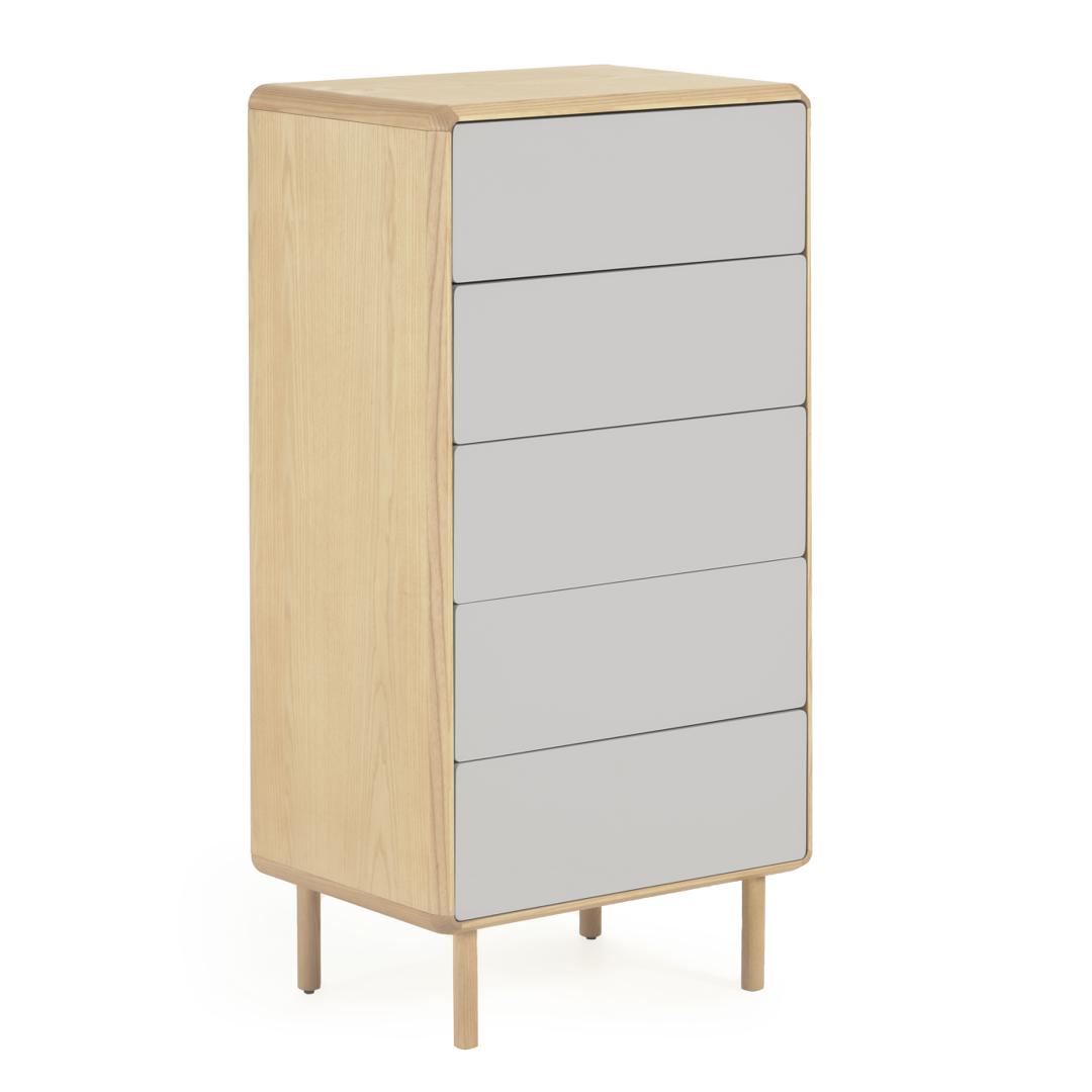 Комод из ясеневого шпона с ножками и каркасом из массива ясеня. Ящики с плавным закрыванием, механизмом открывания push-to-open и регулируемыми ножками. Фасад окрашен в серо-белый цвет.