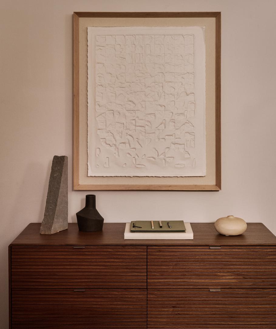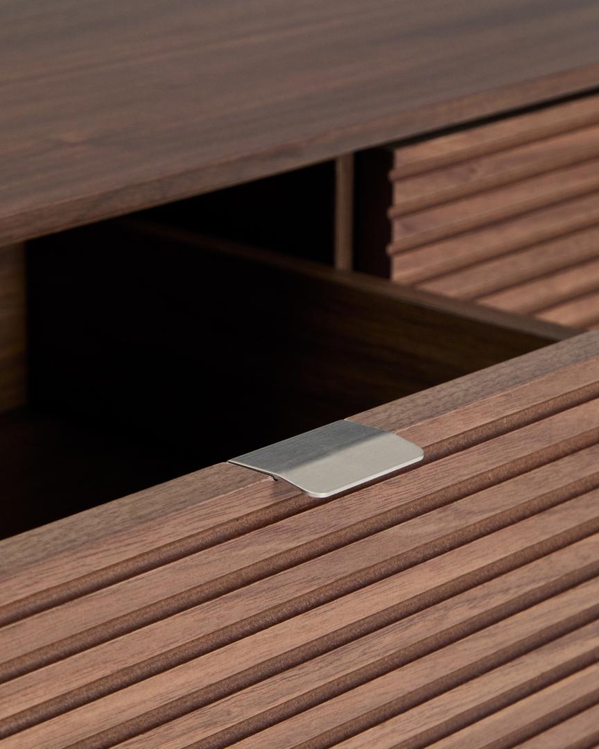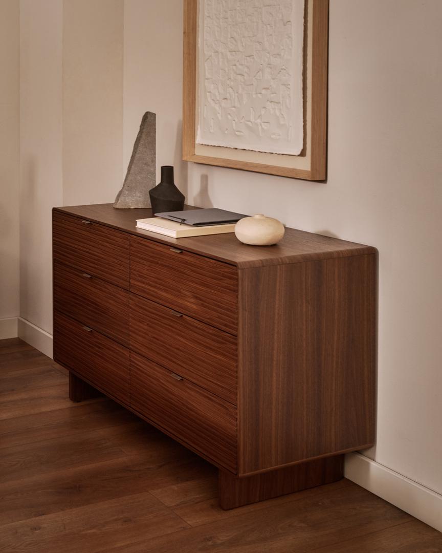 Norlen отдаёт дань уважения дизайну 1950-х годов в современной интерпретации, сочетая минималистичные формы и винтажные детали. Слегка закруглённые углы и деревянное основание создают ностальгическую атмосферу, переосмысленную благодаря чистым линиям и современным пропорциям. Тёмный ореховый шпон, нанесённый методом вакуумной мембранной печати, идеально подходит к радиусам мебели, объединяя отделку и придавая глубину и индивидуальность каждому предмету. Он покрыт полиуретановым лаком, обеспечивающим устойчивость к износу и влаге.