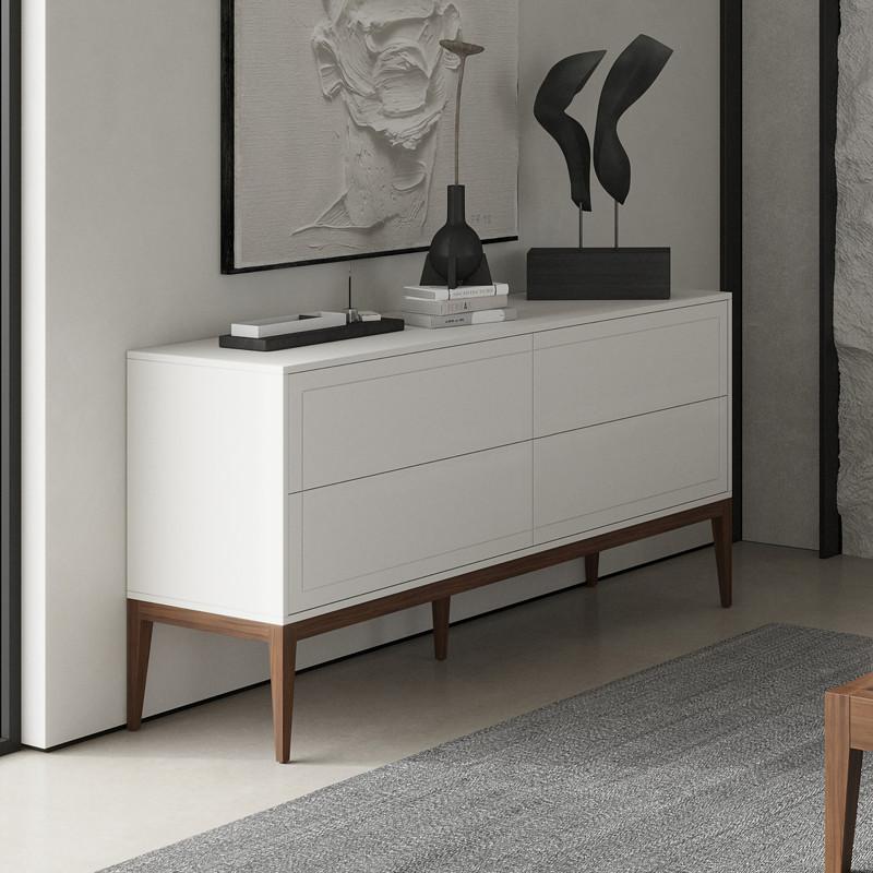 Широкий белый комод с четырьмя ящиками, на высоких ножках из коллекции Marbella от бренда MOD Interiors. Модель с дизайнерской фрезеровкой фасадов в лаконичном стиле. Корпус комода выполнен из высококачественного сертифицированного МДФ высокой прочности в отделке матовый лак светло-серого оттенка. База комода изготовлена из массива дерева с натуральным шпоном ореха. Внутри ящики оснащены системой легкого открывания push-to-open. Обратите внимание на большую ширину комода — 159 см.