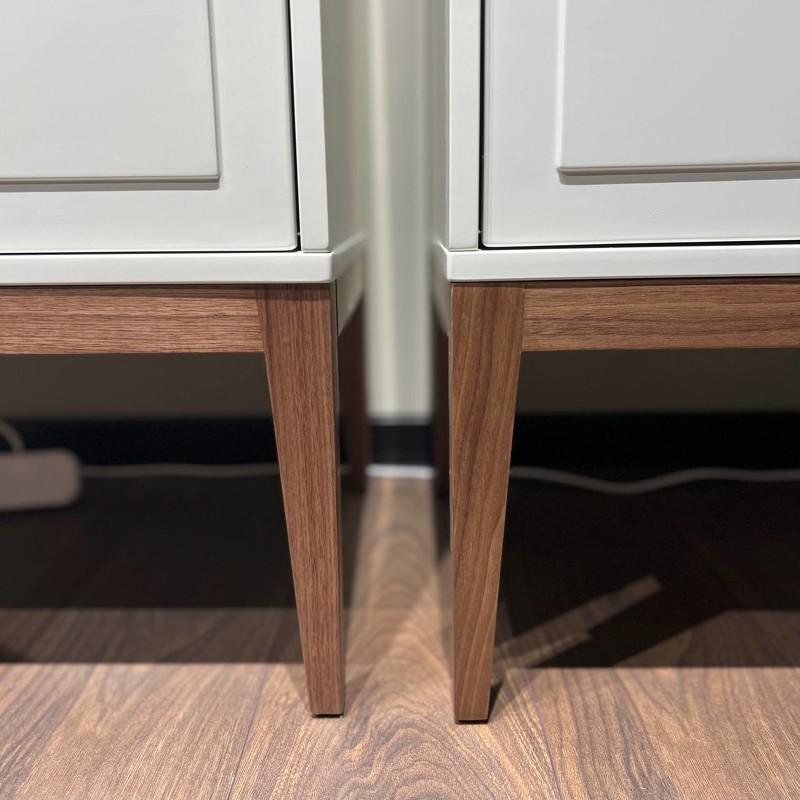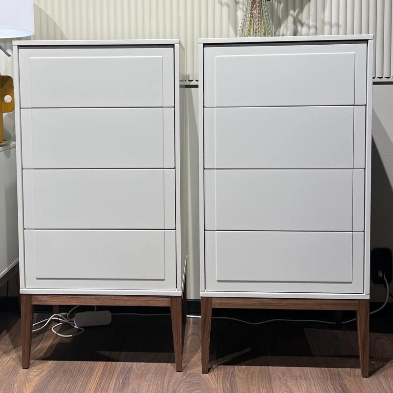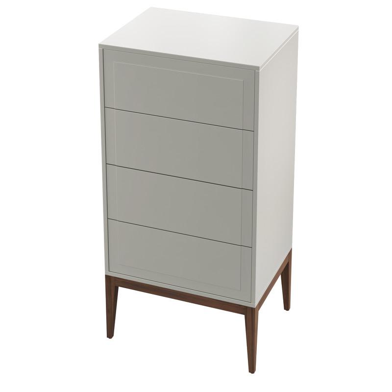 Высокий комод с четырьмя ящиками, на высоких ножках из коллекции Marbella от бренда MOD Interiors. Лаконичные фасады с интересной фрезеровкой. Корпус комода выполнен из высококачественного МДФ высокой прочности в отделке матовый лак светло-серого оттенка. База комода изготовлена из массива дерева с покрытием из натурального шпона ореха. Внутри все ящики оснащены системой легкого открывания push-to-open. Качественные и долговечные механизмы. Цена указана за 1 комод.