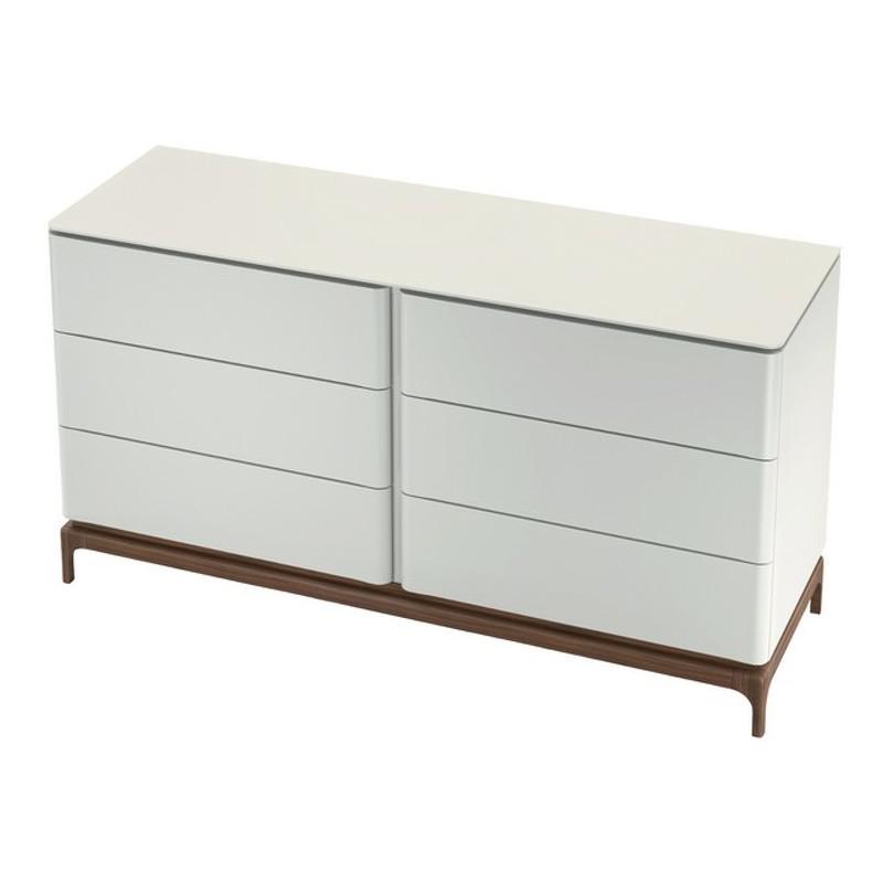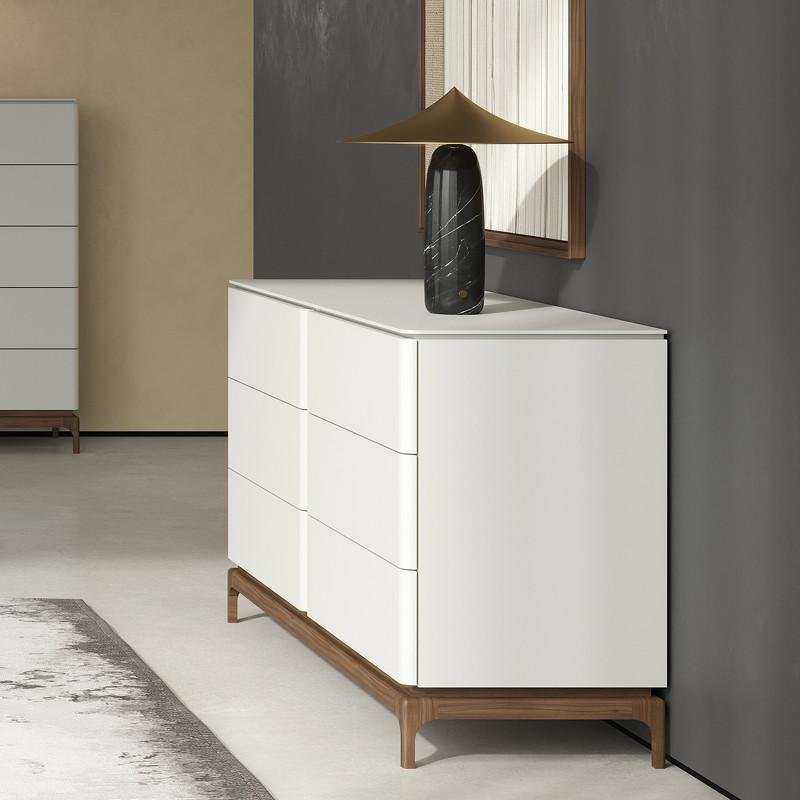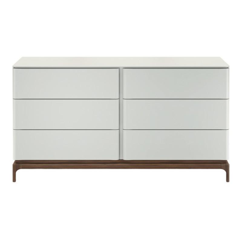 Вместительный комод от бренда Mod Interiors. Столешница и корпус комода выполнены из высококачественного сертифицированного МДФ высокой прочности в отделке матовый лак светло-серого оттенка. База комода изготовлена из массива дерева с покрытием из натурального шпона ореха. У комода 6 ящиков со скрытыми направляющими и системой открывания push to open (открывание нажатием).