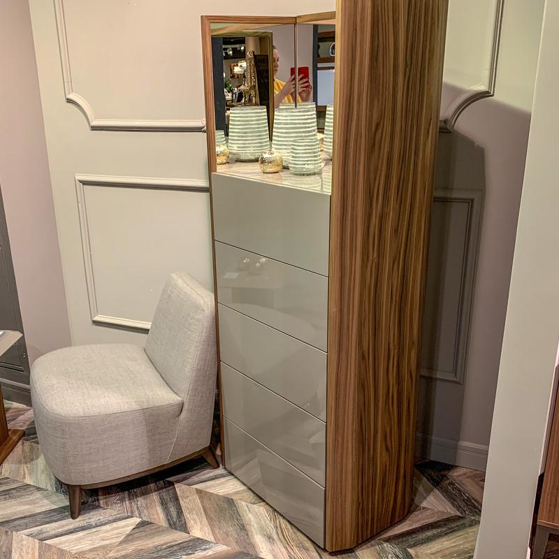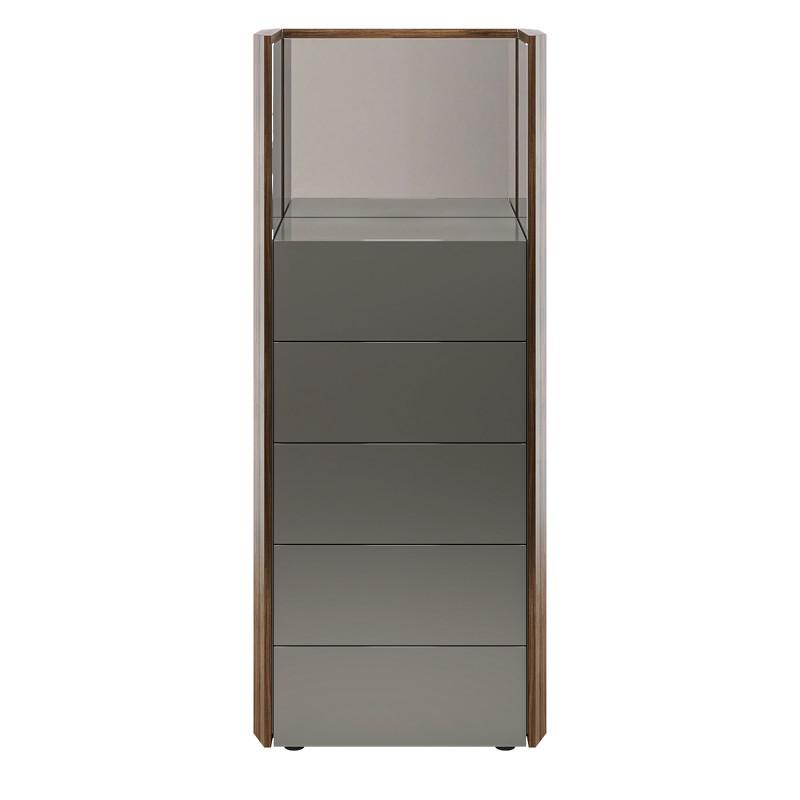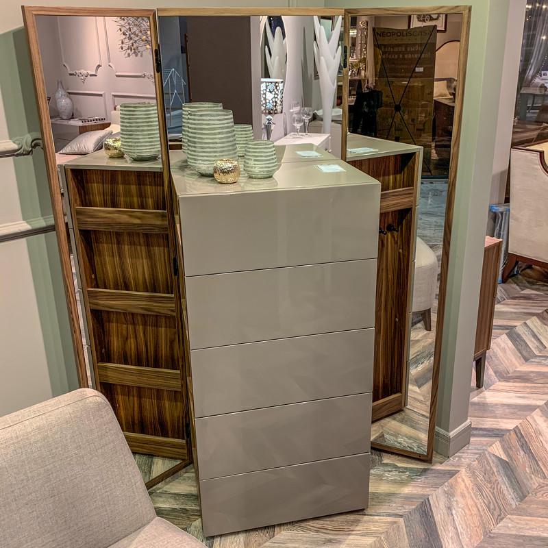 Высокий комод с пятью ящиками из современной коллекции Avila от бренда MOD Interiors. Комод трансформируется — слева и справа есть «крылья» с зеркалами, которые могут раскрываться и открывать доступ к боковым модулям с крючками. Комбинированный дизайн из глянцевого лака и древесины в шпоне натурального ореха. Высококачественная сертифицированная МДФ высокой плотности. Комод оснащен системой легкого открывания push-to-open. Все ящики снабжены направляющими системы soft-close. Уникальная система последнего поколения добавляет невероятную плавность открывания/закрывания и дает высокую динамическую нагрузку. Зеркала прикреплены к комоду с помощью итальянских шарниров Koblenz, отличающихся высоким качеством.