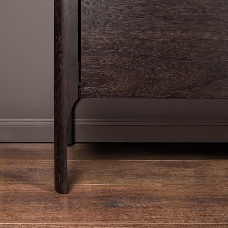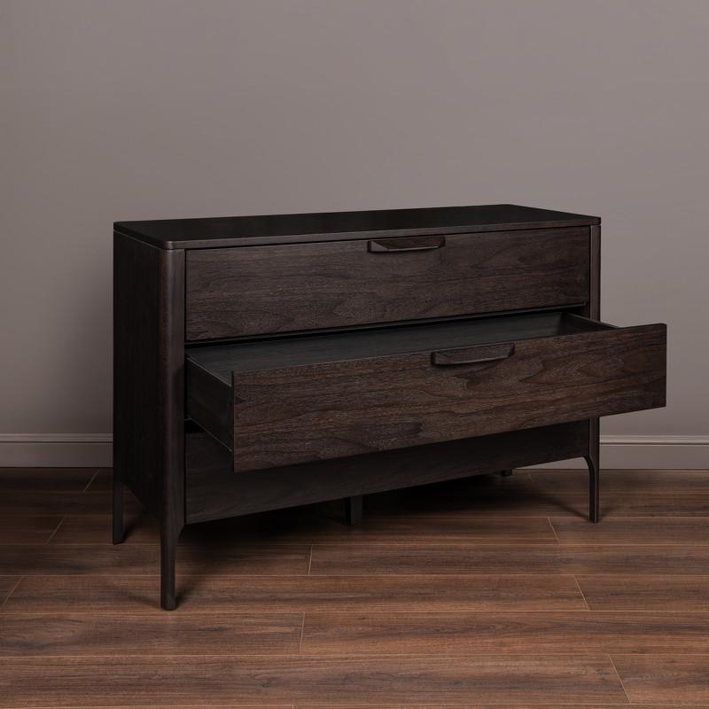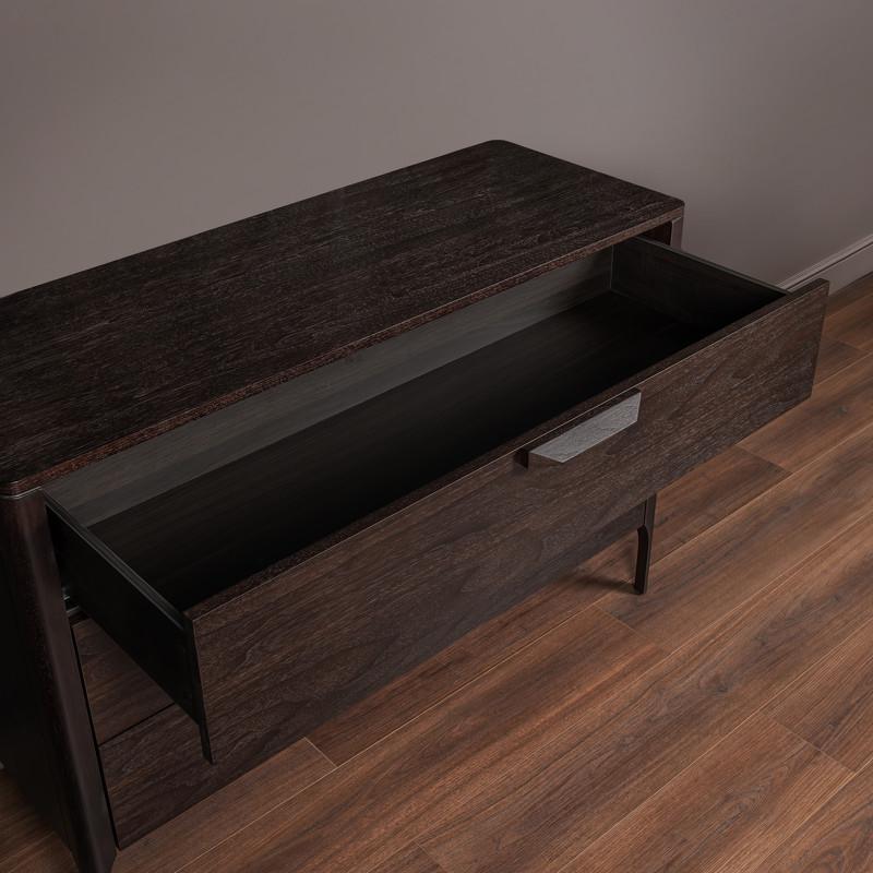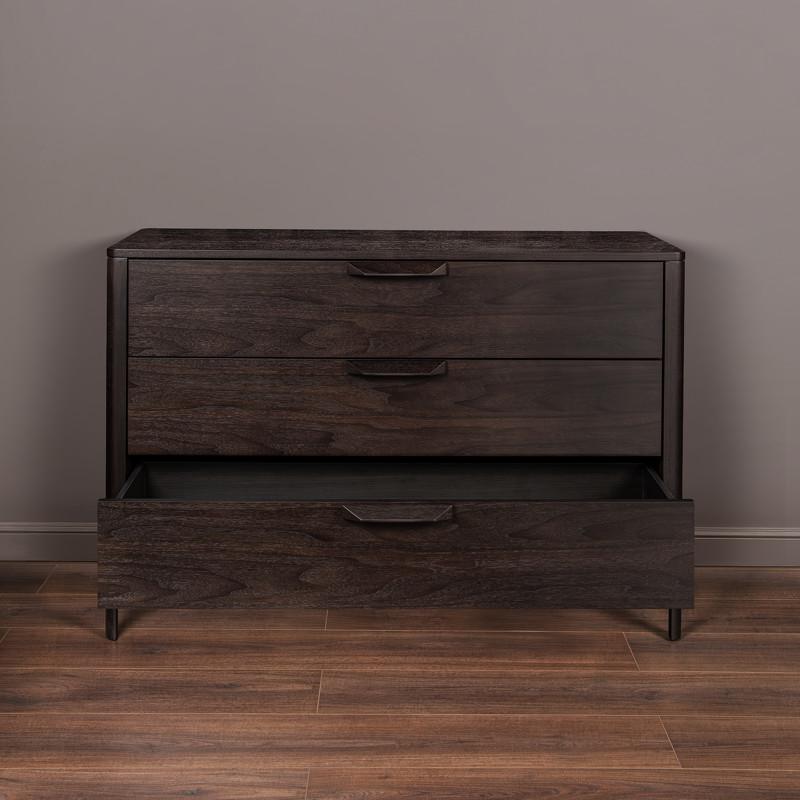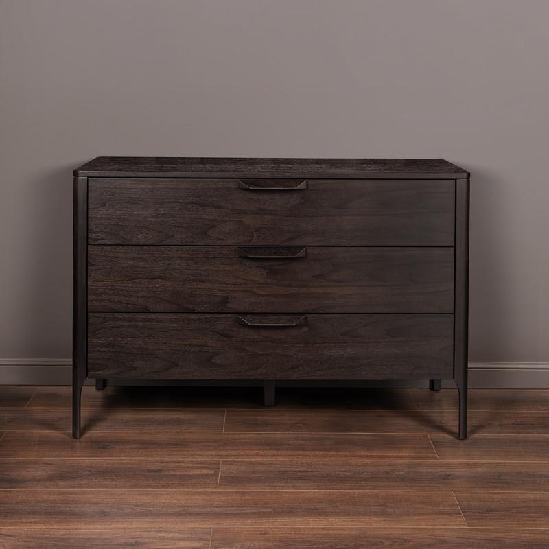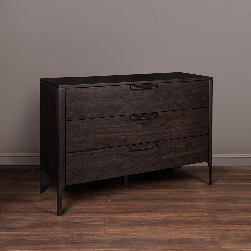 Компактный комод бренда MOD Interiors можно использовать в спальне, гостиной или столовой в современном стиле. Корпус и фасады комода изготовлены из высококачественного МДФ высокой плотности, Ножки и ручки - из массива дерева. Отделка - натуральный шпон ореха, тонированный в цвет горького шоколада. Комод оснащен тремя выдвижными ящиками. Все ящика снабжены направляющими системы soft-close. Уникальная система последнего поколения добавляет невероятную плавность открывания/закрывания. Высота фасадов каждого ящика 20 см Высота ножек 18 см
