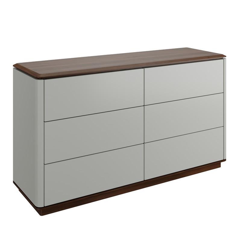 Стильный габаритный комод с шестью ящиками из модной коллекции Altea от бренда MOD Interiors. Комод выполнен из высококачественного МДФ высокой прочности. Отделка корпуса и фасадов - матовый лак приятного светло-серого оттенка. Отделка столешницы и базы - натуральный шпон ореха. Ящики дополнены системой легкого открывания push-to-open (открывание нажатием без ручек). Фасады гладкие, без узора.