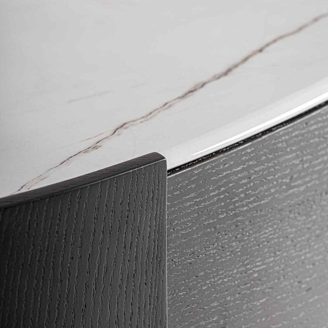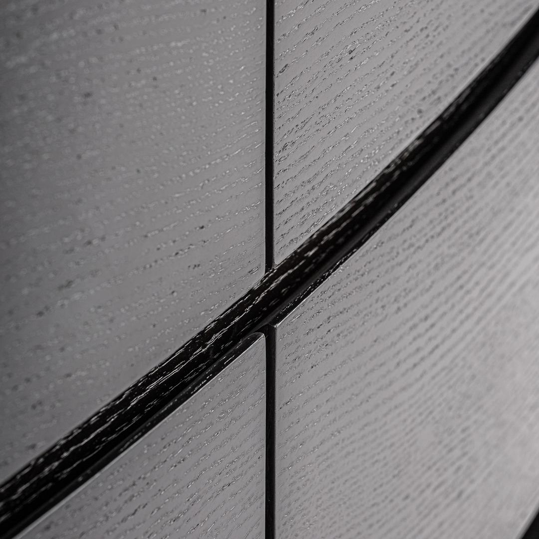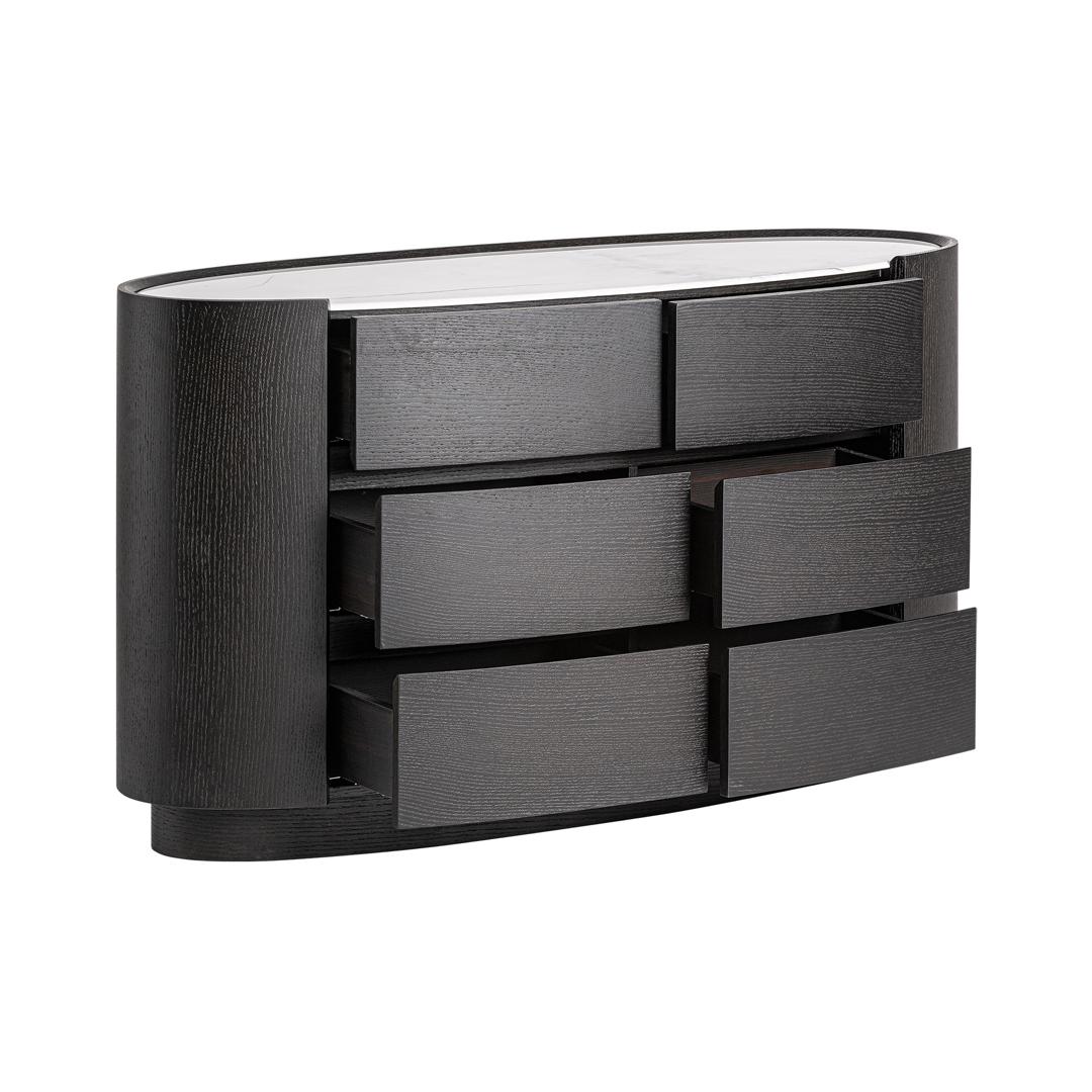 Комод Isola в современном стиле, изготовлен из черной фанеры в сочетании с черным дубовым шпоном и белым спеченным камнем. Ширина: 140 см, Глубина: 45 см, Высота: 75 см