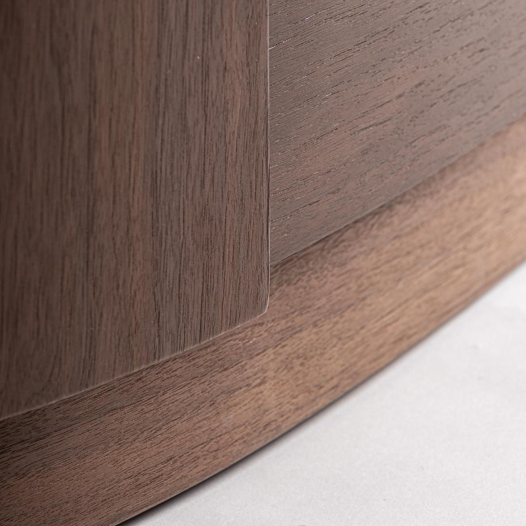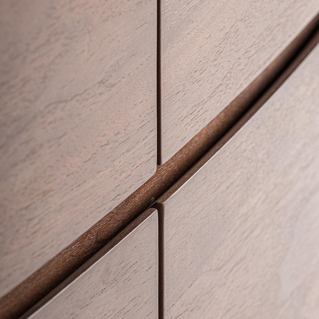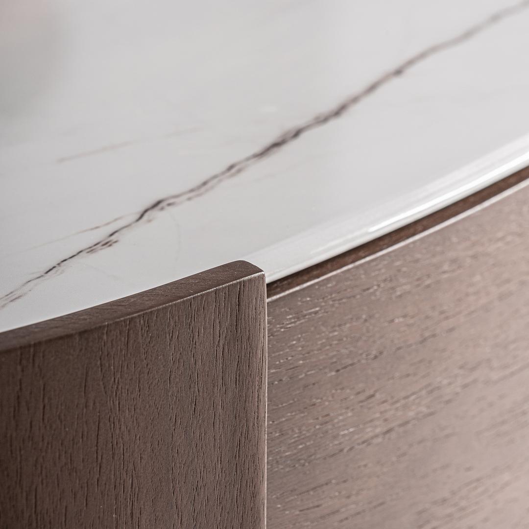 Комод Stuetta в современном стиле, изготовлен из коричневой фанеры в сочетании с коричневым дубовым шпоном и белым спеченным камнем. Ширина: 140 см, Глубина: 43 см, Высота: 76 см