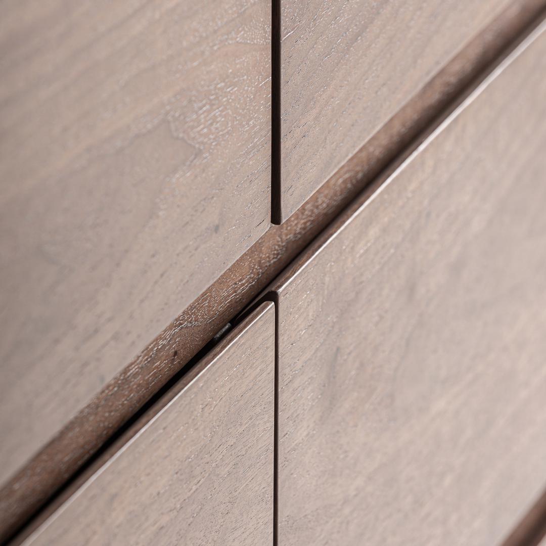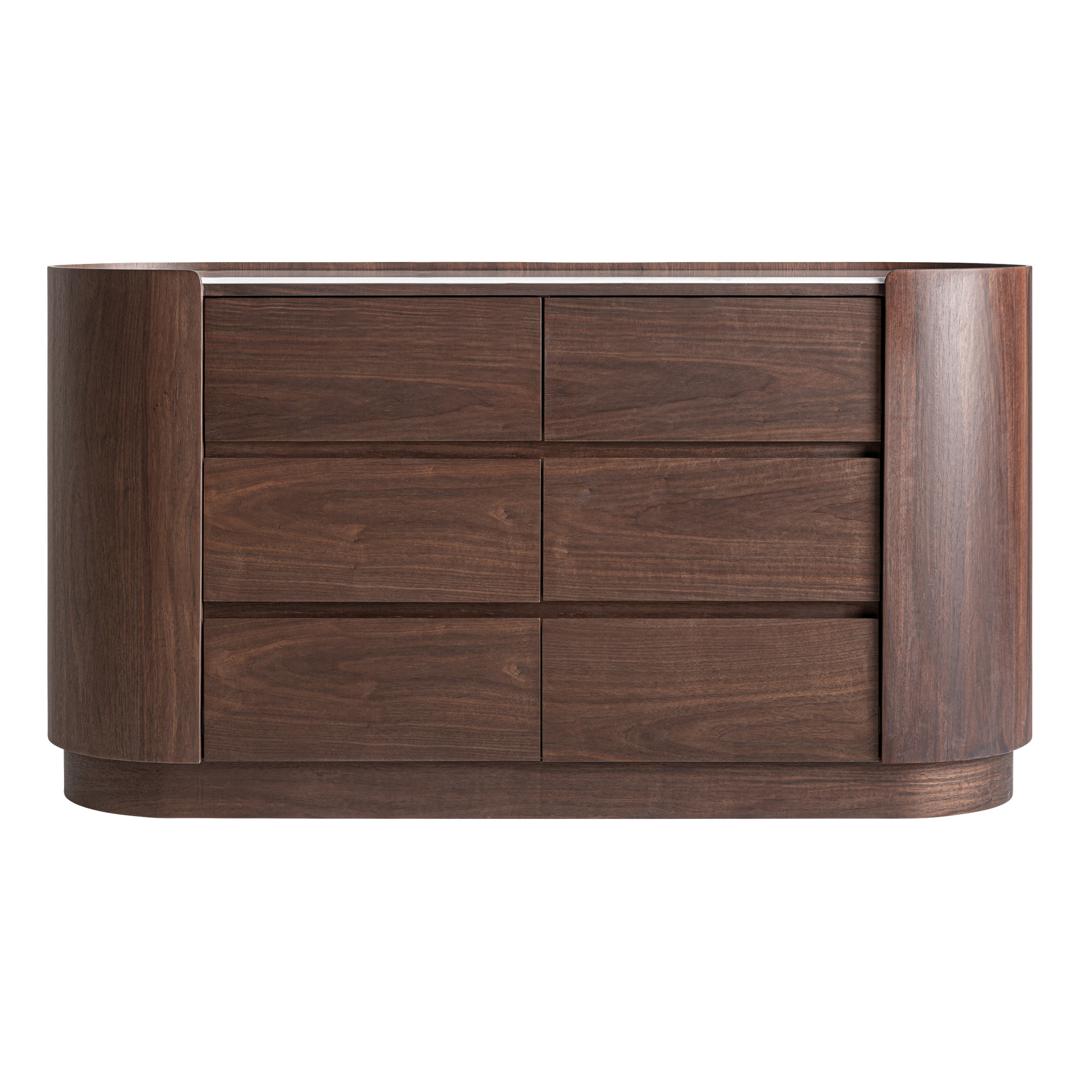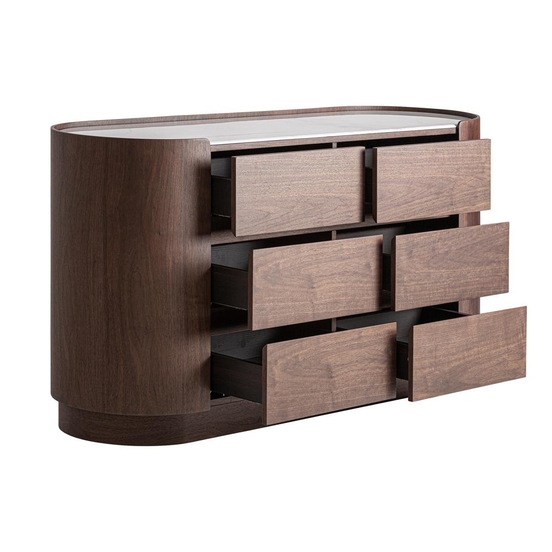 Современный комод Stuetta, изготовленный из коричневой фанеры в сочетании с дубовым шпоном и белым спеченным камнем с прожилками. Ширина: 140 см, Глубина: 45 см, Высота: 76 см