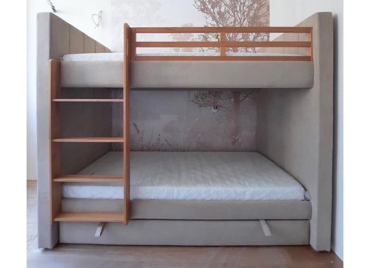 Мягкая уютная двухъярусная кровать Cosy может быть выполнена в различных цветах: бежевый, серый, розовый или голубой. В комплект входит вместительный ящик для хранения постельный принадлежностей или игрушек. Кровать имеет просторное спальное место 90*200 см. Дополнительно можно заказать защитные бортики на нижний ярус. Материал: бук, береза Обивка: ткань микрошенилл