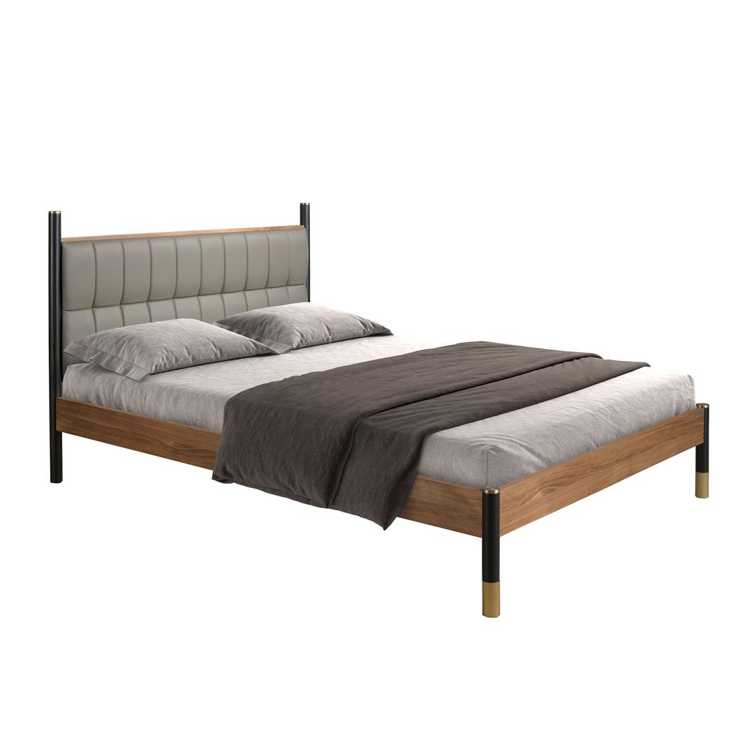 Современная двуспальная кровать с оригинальным изголовьем из темно-серого кожзаменителя и деревянной конструкцией, шпонированной натуральным ореховым цветом , и черными деревянными ножками из МДФ . Ключевой элемент для вашей спальни, с которым вы добавите элегантный и уютный стиль. В комплект входит удобное многоспальное основание из сосны