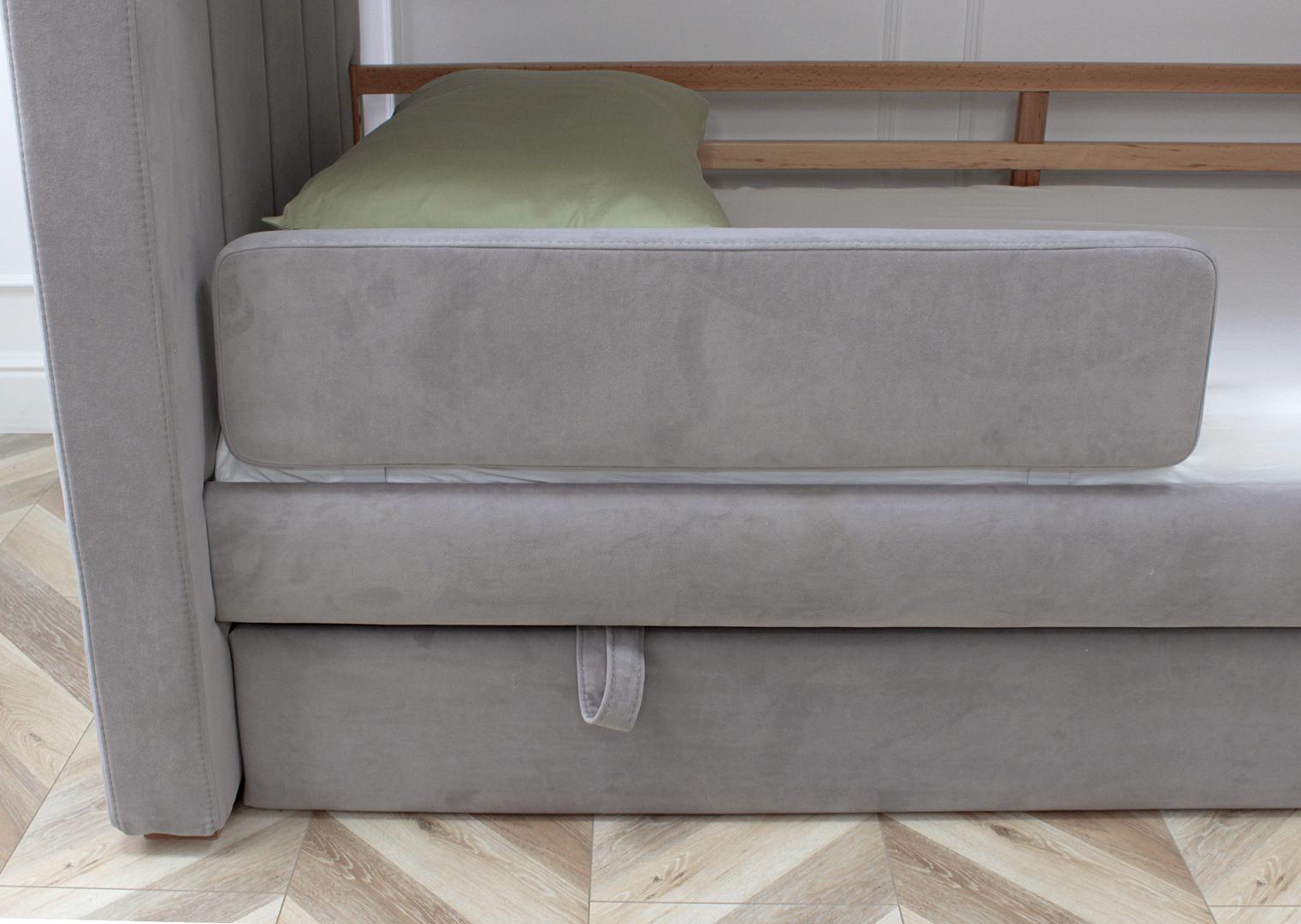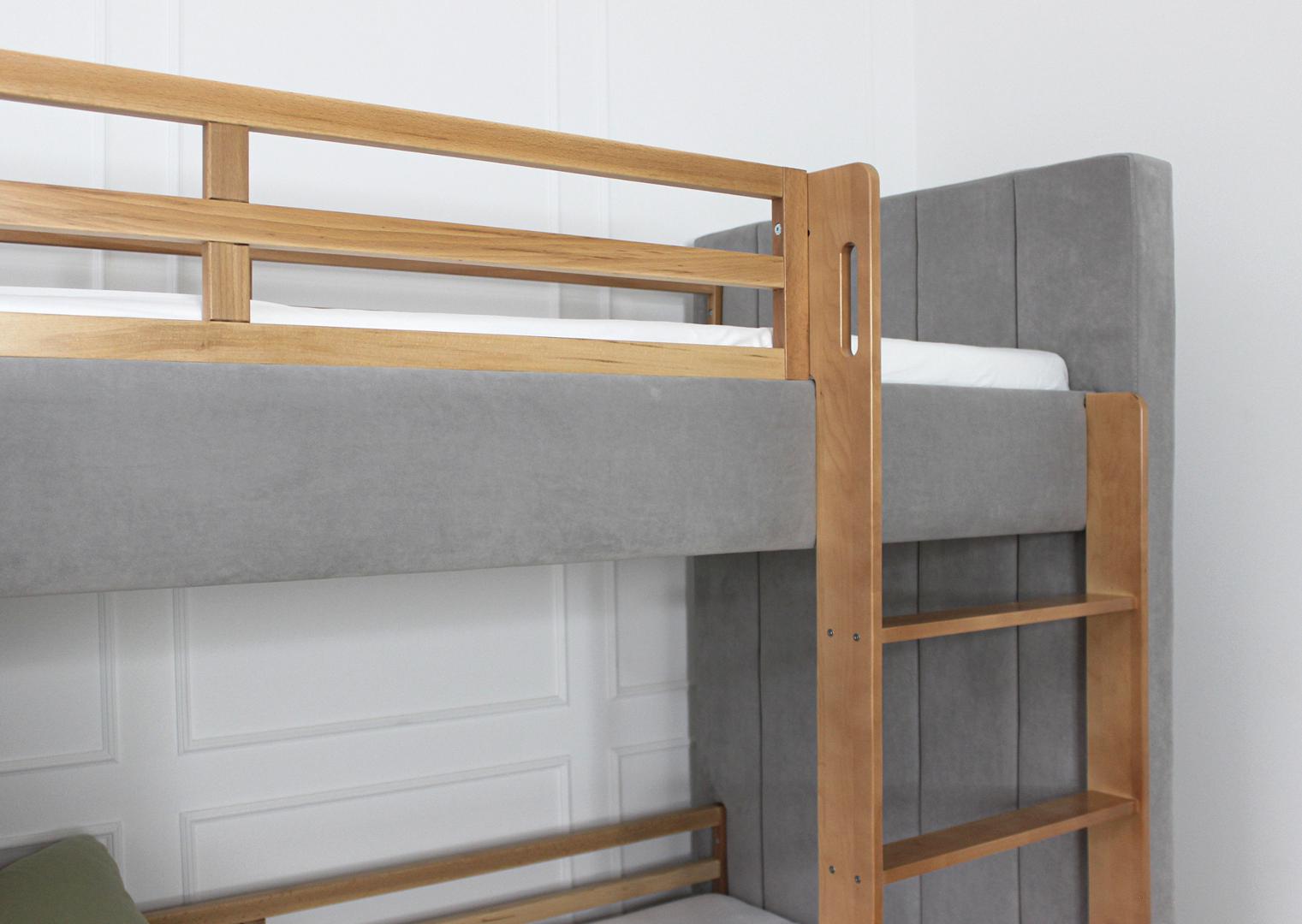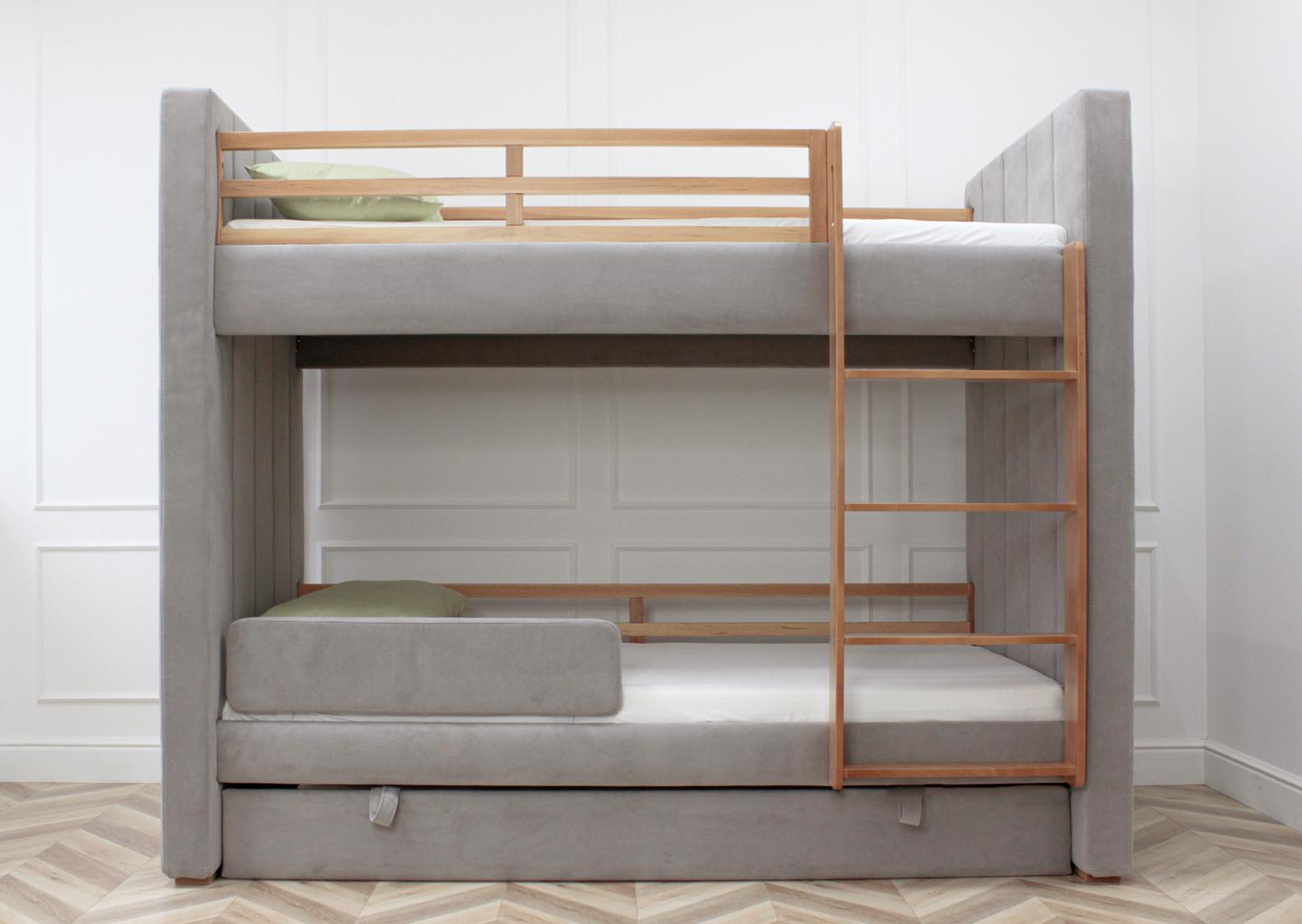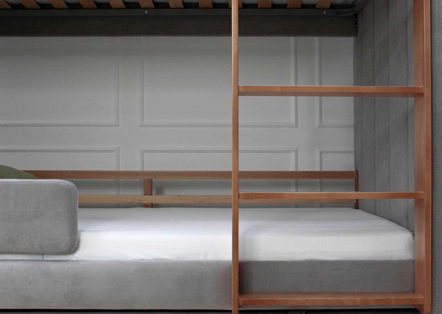 Мягкая уютная двухъярусная кровать Cosy может быть выполнена в различных цветах: бежевый, серый или розовый В комплект входит вместительный ящик для хранения постельный принадлежностей или игрушек Кровать имеет просторное спальное место 90*200 см Дополнительно можно заказать защитные бортики на нижний ярус Материал: бук, береза Обивка: антивандальная ткань *Матрасы продаются отдельно