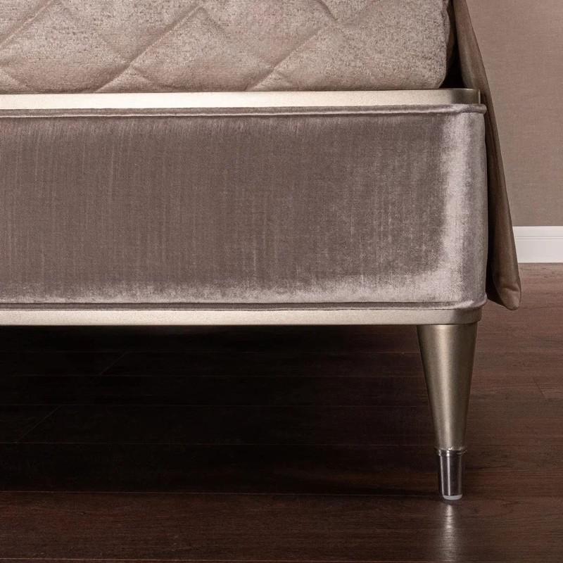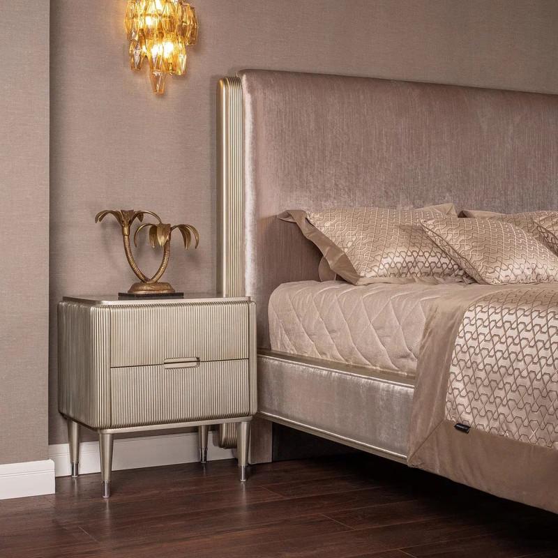 Изящная кровать от итальянского бренда Fratelli Barri с ребристым декором изголовья и ножками в виде конусов. Изголовье и средняя часть базы обиты тканью и ассортимента фабрики в серебристых тонах. Отделка деревянных элементов - патинированное серебро. На ножках металлические колпачки. Выполнена из массива дерева и МДФ высокой плотности. Тип ткани - велюр. Состав ткани - 100% terylene. Обратная сторона изголовья обита плотной технической тканью. Цвет фурнитуры - хром. Кровать прекрасно сочетается с корпусной мебелью из коллекции Rimini. Размер спального места — 180*200 см. Кровать поставляется в комплекте с решеткой. Покрывала, подушки и матрас не входят в комплект поставки.