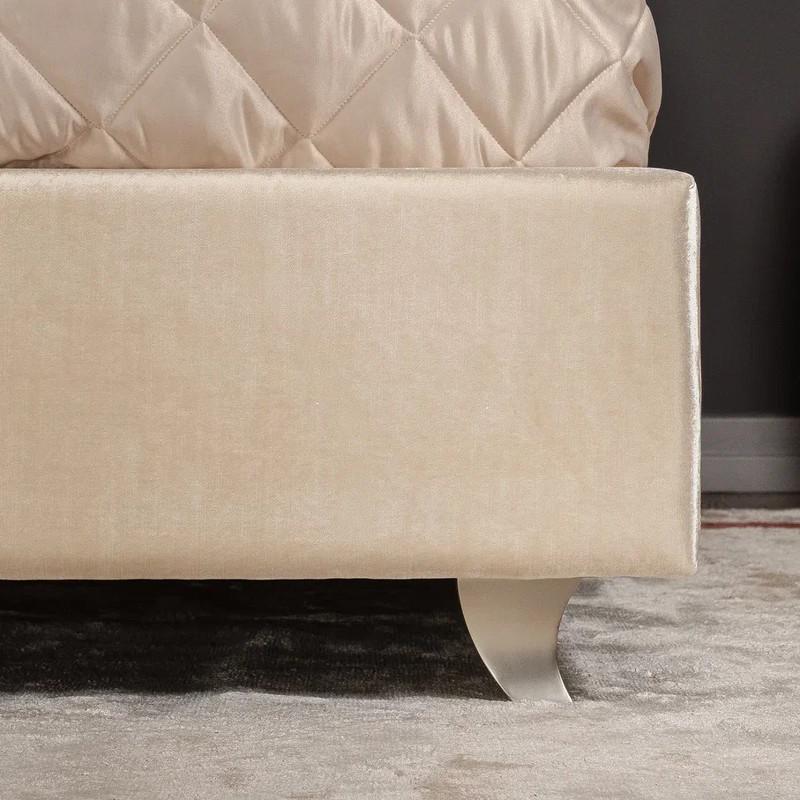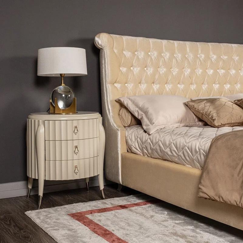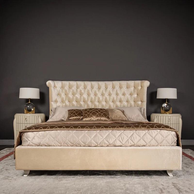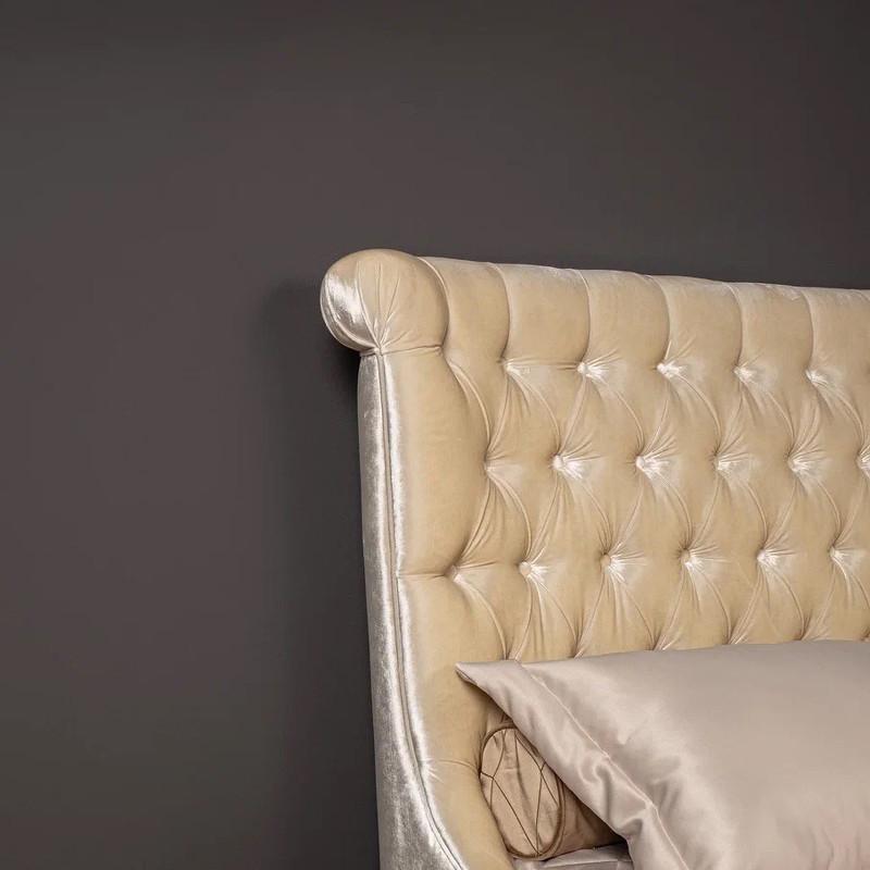Эксклюзивная модель двуспальной кровати на низких серебряных ножках. Модель выполнена в неоклассическом стиле. Высокое изогнутое изголовье декорировано стежкой «капитоне». Обратите внимание на необычную форму изголовья по бокам — как наверху изголовья, так и на уровне матраса. Такая модель ощущается очень уютной благодаря таким деталям. Кровать идеально сочетается с корпусной мебелью из коллекции Roma фабрики Fratelli Barri. Размер спального места — 180*200 см. Покрывала, подушки и матрас не входят в комплект поставки. Решетка в комплекте.