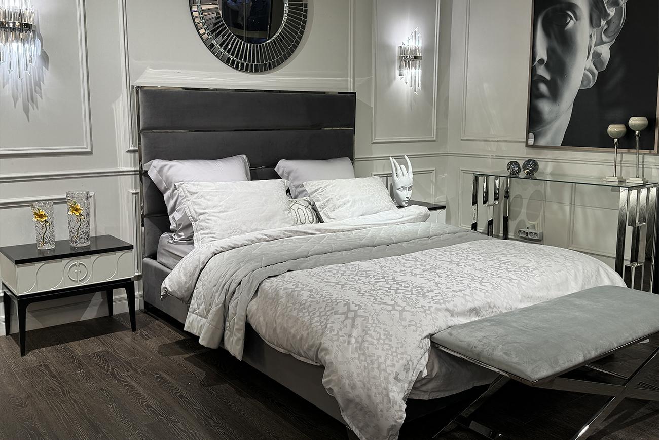 description-full - Стильная велюровая двуспальная кровать станет прекрасным украшением современной спальни. Высокое изголовье в виде мягких панелей добавляет мебели шика и аристократической элегантности. За устойчивость и надежность отвечает каркас из дерева и металлические ножки. Роскошная кровать с изголовьем обеспечивает комфортный отдых, гармонично сочетается с современной мебелью в спальне. Мебель изготовлена из экологичных, долговечных материалов премиум качества, по европейским технологиям. Если нужна удобная и красивая двуспальная кровать, данная модель будет отличным выбором. Купить ее можно с доставкой по Москве и в регионы РФ.