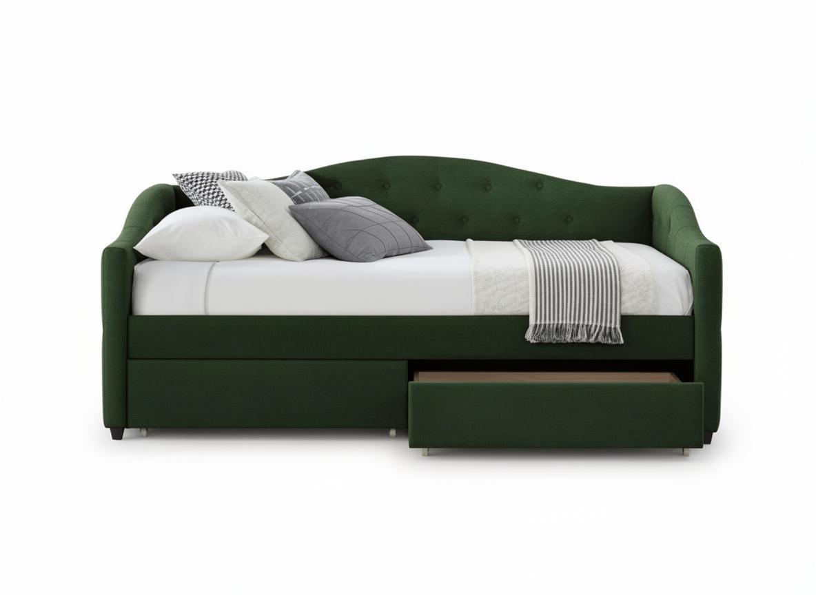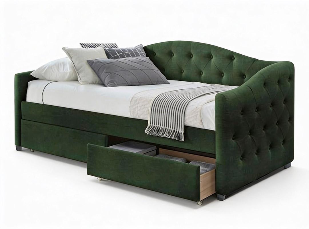 Вес, кг: 64,5 / Высота (см): 93 / Гарантия, мес.: 12 / Глубина (см): 221 / Количество коробок: 3 / Материал каркаса: вельвет / Необходимость сборки: да / Размер матраса (см): 90/200 / Размер упаковки 1: 1,03/0,99/0,2 / Размер упаковки 2: 2,16/0,61/0,07 / Размер упаковки 3: 1,11/0,55/0,07 / Страна производитель: Китай / Цвет: зеленый / Ширина (см): 98
