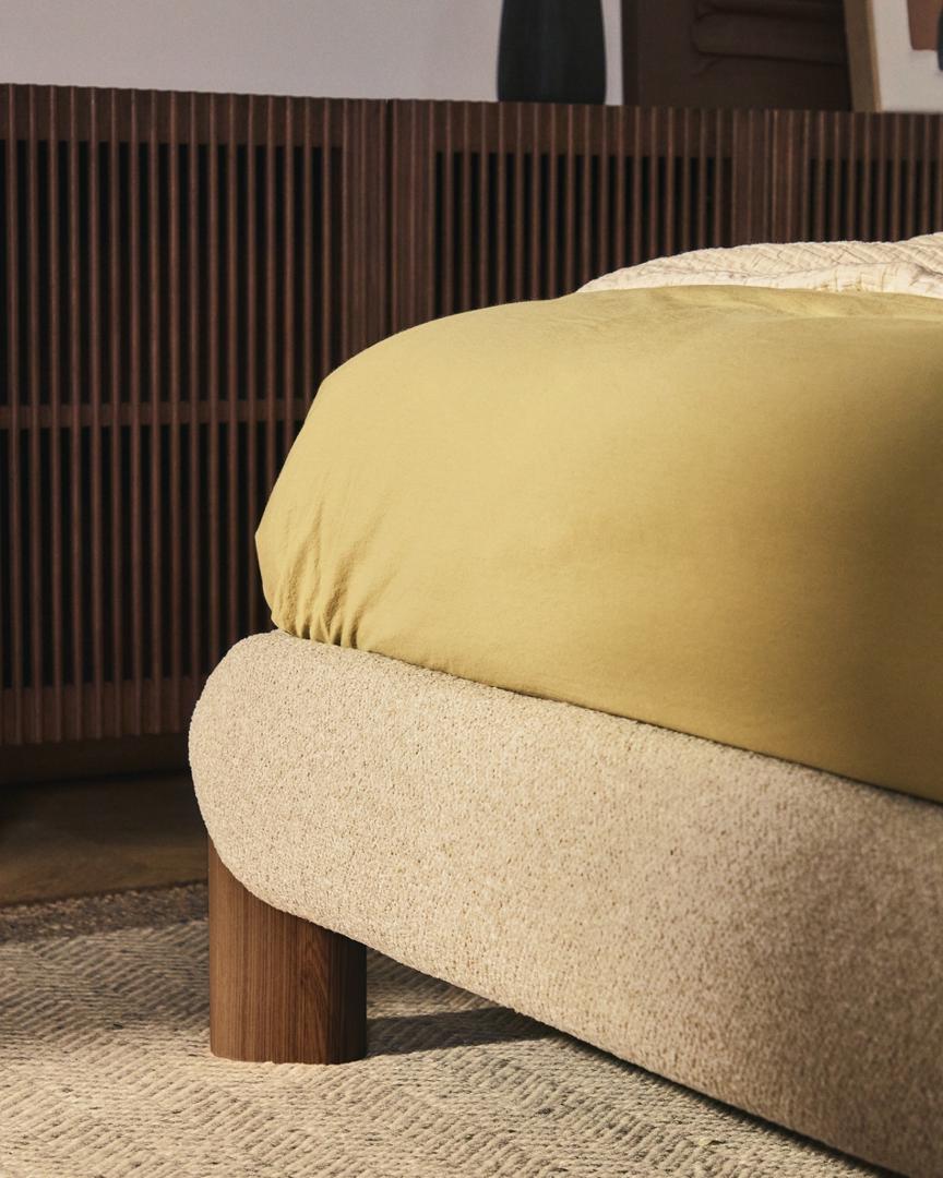 Эта кровать со съемным чехлом из ткани букле переосмысливает современную элегантность благодаря округлому дизайну, который простирается от каркаса до изголовья и ножек, создавая мягкий и уютный силуэт, способствующий сну. Ножки из массива ясеня, тщательно спроектированные так, чтобы выступать над чехлом, добавляют изысканности и оригинальности, создавая визуальный эффект мягкой кровати, несмотря на то, что чехол полностью съемный. Внутри каркаса сочетаются дерево и пена разной плотности.