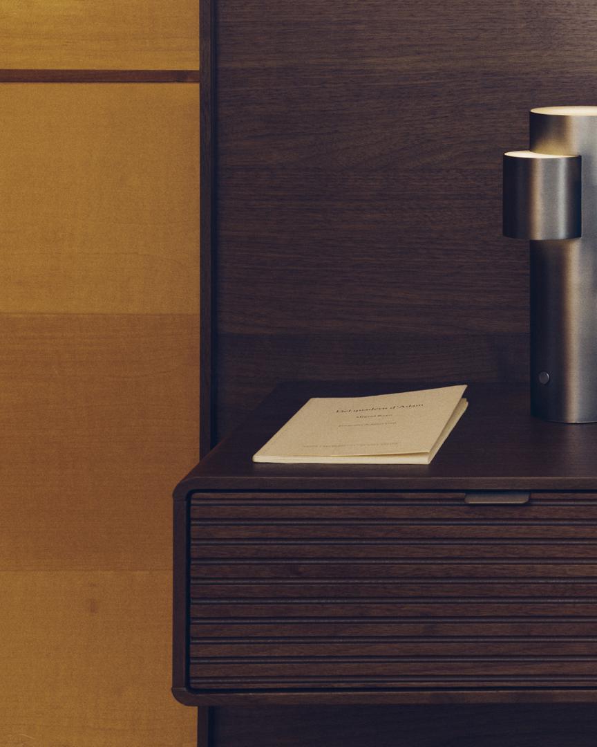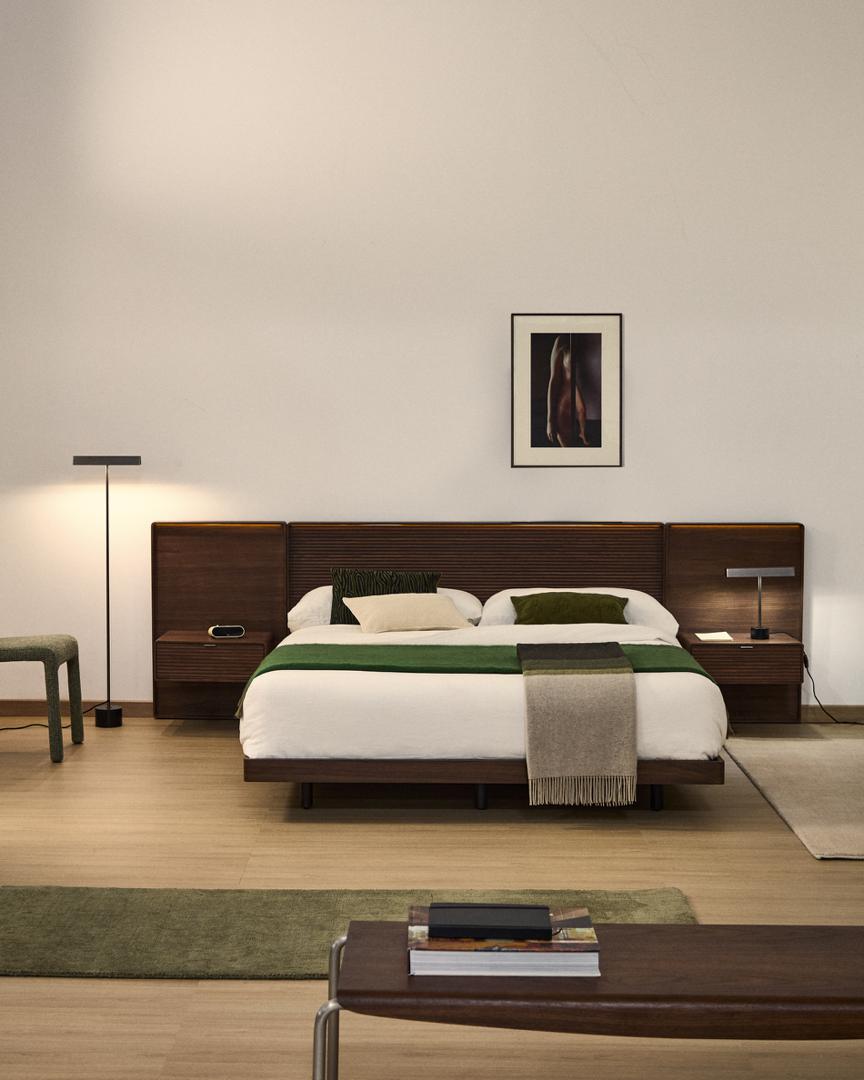 Norlen отдаёт дань уважения дизайну 1950-х годов в современной интерпретации, сочетая минималистичные формы и винтажные детали. Слегка закруглённые углы и деревянное основание создают ностальгическую атмосферу, переосмысленную благодаря чистым линиям и современным пропорциям. Изголовье, выполненное из орехового шпона с изящной горизонтальной линейной фрезеровкой, добавляет индивидуальности и визуальной глубины, а встроенная светодиодная лента в верхней части кровати наполняет комнату тёплым и приятным светом 3000K.