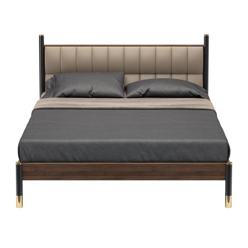 Легкая двуспальная кровать с традиционным силуэтом из коллекции Benissa от бренда MOD Interiors. Изголовье представляет собой классический для Испании вариант с двумя башенками. Форма делает эту модель универсальным вариантом для современного интерьера. Также мебель данной коллекции прекрасно подойдет в интерьер в стиле loft. Черный металл отлично впишется в пространство в природной цветовой гамме с черными или серыми акцентами. Каркас кровати выполнено из высококачественного МДФ. Отделка - натуральный шпон американского ореха. Металлические ножки в матовом черном лаке, детали в цвете латунь. Изголовье обито эко-кожей в бежевых оттенках. Размер спального места у этой модели 160*200 см. Кровать поставляется с решеткой. Текстиль и матрас не входят в комплект поставки.