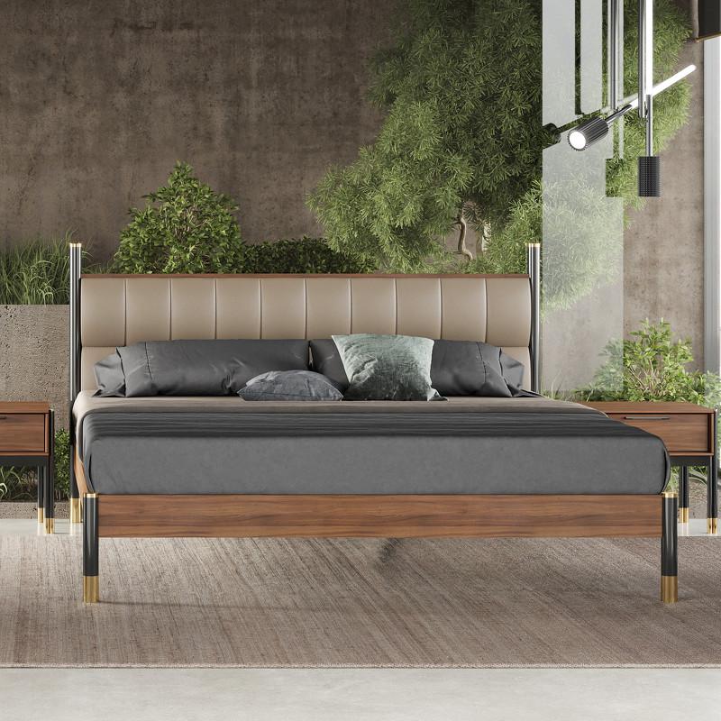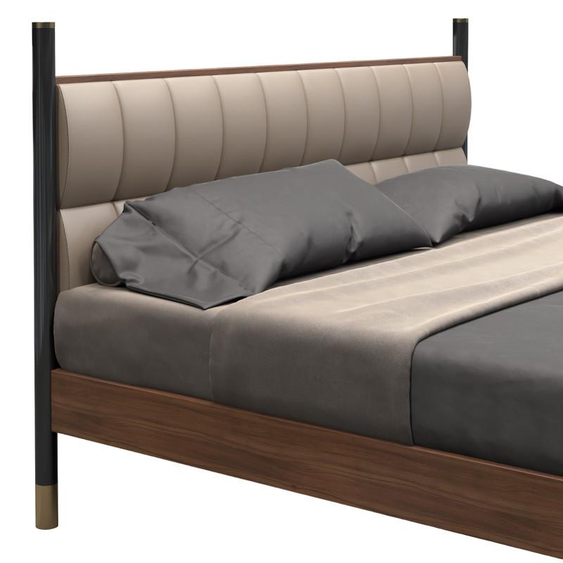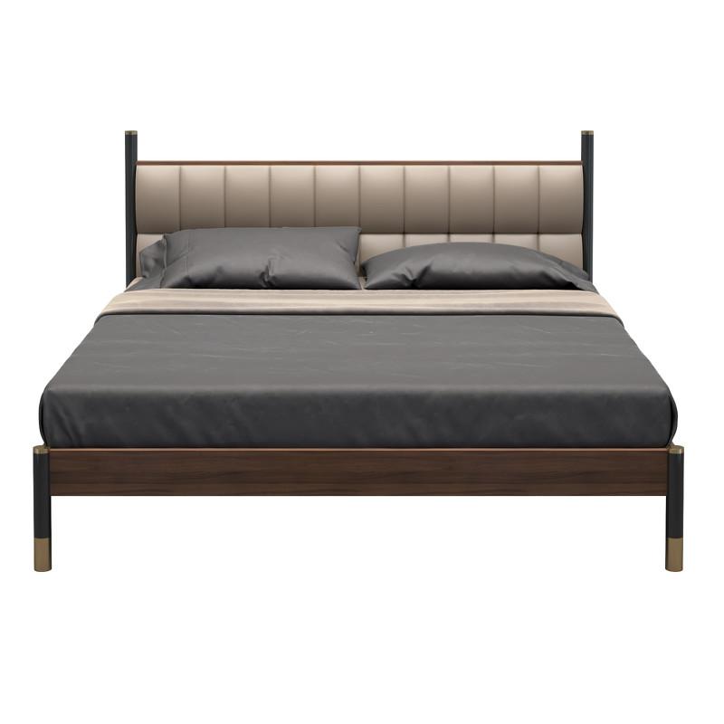 Легкая двуспальная кровать с традиционным силуэтом из коллекции Benissa от бренда MOD Interiors. Изголовье представляет собой классический для Испании вариант с двумя башенками. Форма делает эту модель универсальным вариантом для современного интерьера. Также мебель данной коллекции прекрасно подойдет в интерьер в стиле loft. Черный металл отлично впишется в пространство в природной цветовой гамме с черными или серыми акцентами. Каркас кровати выполнено из высококачественного МДФ. Отделка - натуральный шпон американского ореха. Металлические ножки в матовом черном лаке, детали в цвете латунь. Изголовье обито эко-кожей в бежевых оттенках. Размер спального места у этой модели 180*200 см. Кровать поставляется с решеткой. Текстиль и матрас не входят в комплект поставки.