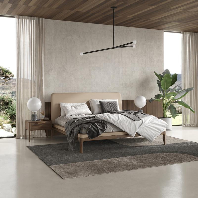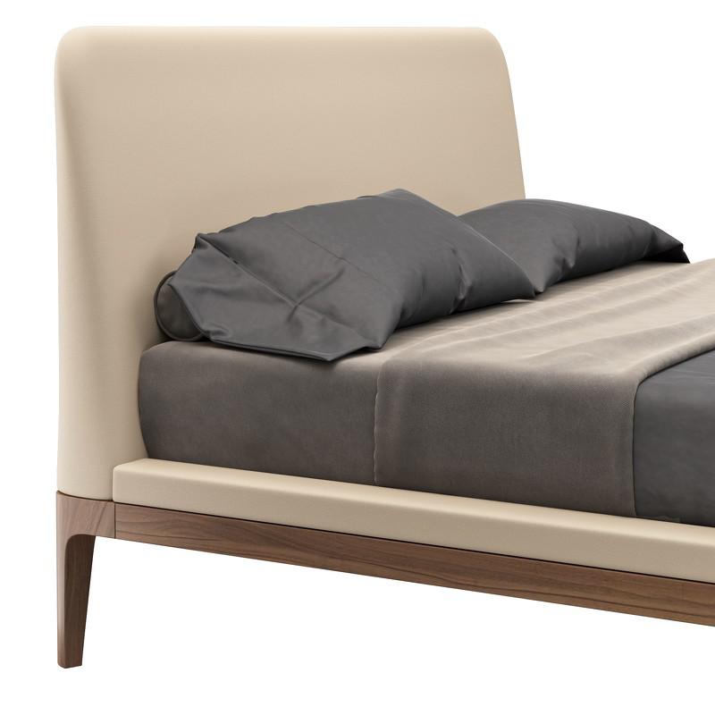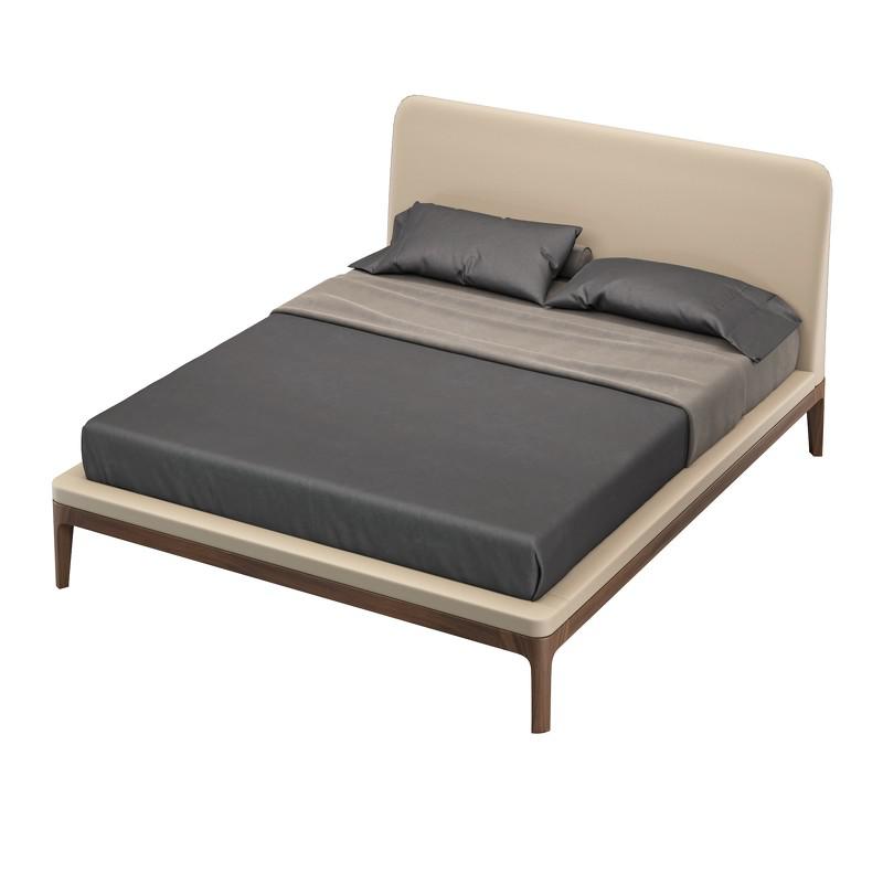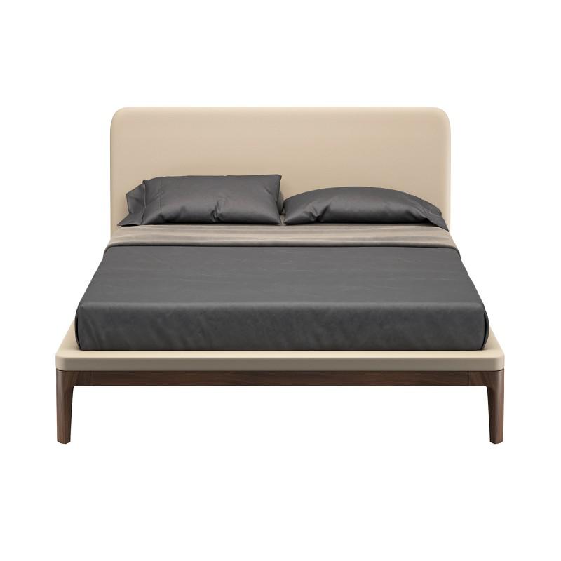 Лаконичная двуспальная кровать из коллекции Ronda от бренда MOD Interiors с изящным силуэтом на ножках. Модель отлично подойдет для интерьера в современном стиле. Изголовье кровати изготовлено из МДФ высокой плотности из Новой Зеландии. База и ножки кровати выполнены из массива дерева. Отделка - натуральный шпон американского ореха. Теплый оттенок ореха отлично подходит к нежному бежевому оттенку эко-кожи на изголовье и базе кровати. Размер спального места — 160*200 см. Кровать поставляется с решеткой. Покрывала, подушки и матрас не входят в комплект. На заказ можно выбрать ткань на изголовье кровати по образцам фабрики. Рекомендуется использовать матрас высотой 18-21 см
