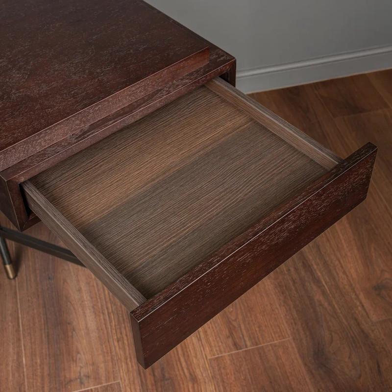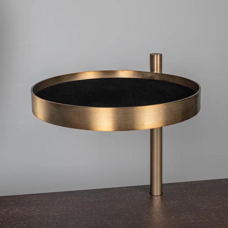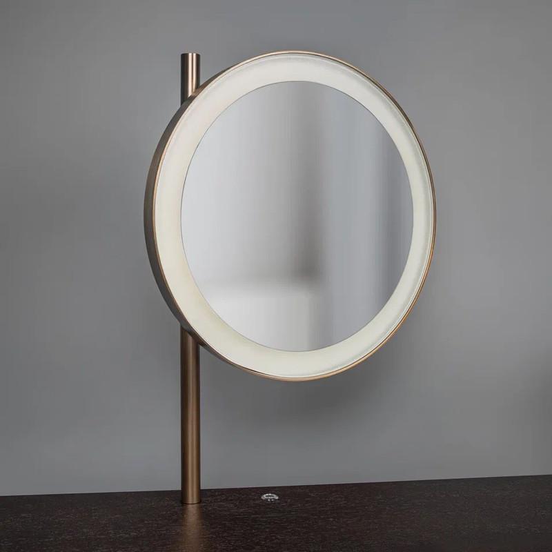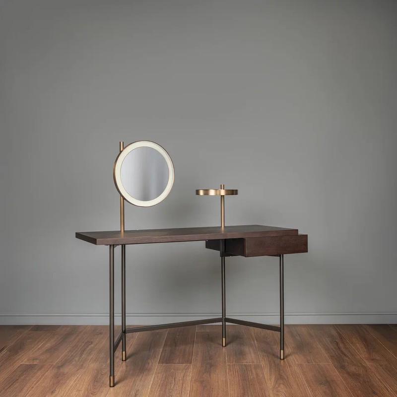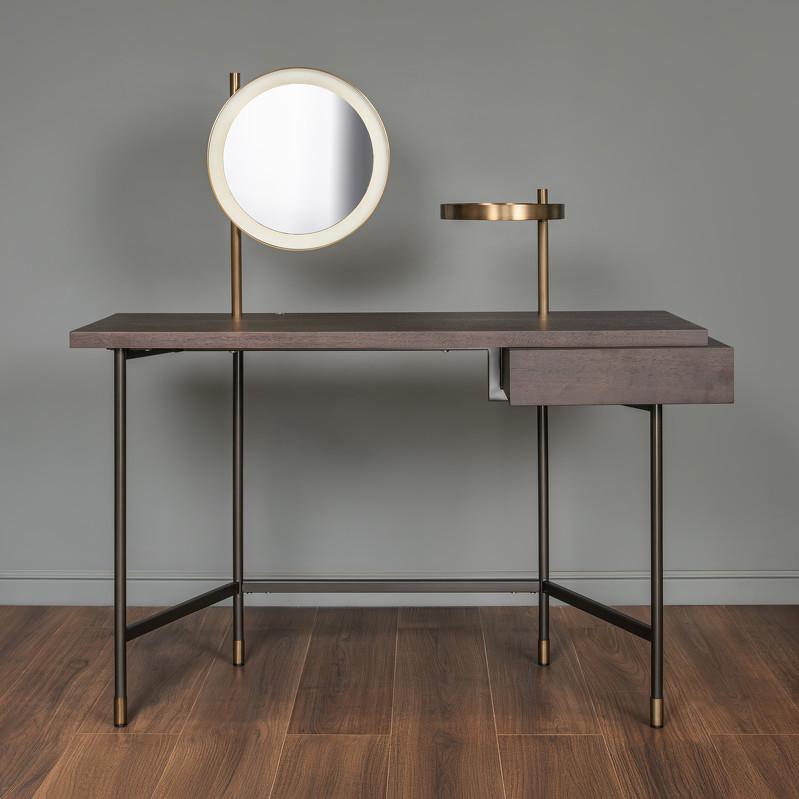 Туалетный столик с зеркалом, оснащенным подсветкой и выдвижным ящиком от бренда Fratelli Barri. Столешница и фасад ящика выполнены из высококачественного МДФ. Отделка - натуральный шпон ореха тонированный в цвет горького шоколада. Ножки - металл в лаке черного цвета с легким глянцем. Рама зеркала, декоративные элементы на столешнице и колпачки на ножках - нержавеющая сталь в цвете латунь. Проводная подсветка включается сенсорной кнопкой на столешнице. Лампа входит в комплект. Ящик оснащен скрытыми направляющими и системой плавного закрывания soft closing.