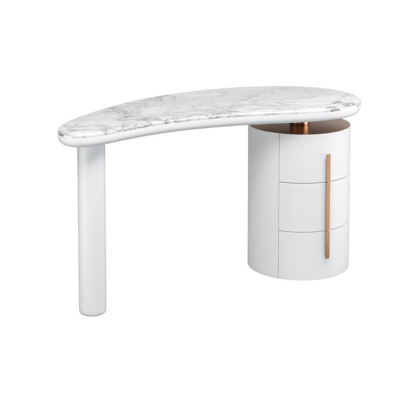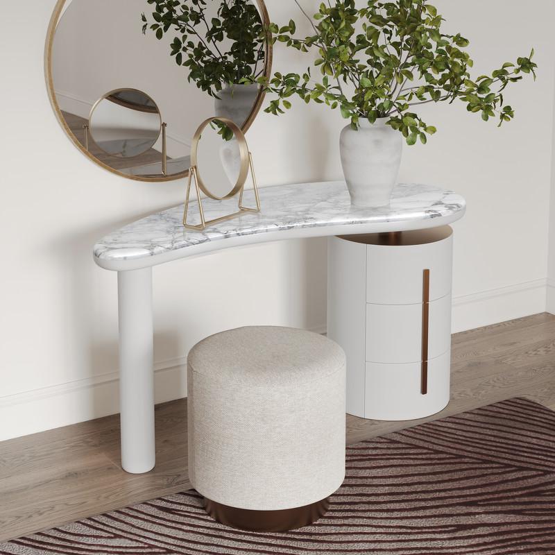 Туалетный столик от итальянского бренда Fratelli Barri оснащен тремя выдвижными ящиками, благодаря чему можно организовать удобное хранение. Столешница выполнена из мрамора Arabescato, корпус покрыт белым матовым лаком, основание из нержавеющей стали в цвете бронза.