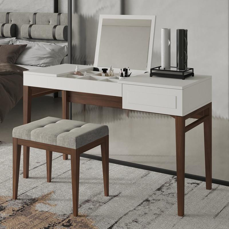 Изящный туалетный столик на высоких стройных ножках из коллекции Marbella от бренда MOD Interiors. Модель дополнена ящиком и откидной крышкой. На внутренней стороне крышки удобное зеркало. Под крышкой расположен место для хранения косметики и украшений. Дизайнерская фрезеровка в лаконичном стиле выглядит очень стильно. Отделка корпуса — матовый лак приятного светло-серого оттенка. корпус изготовлен из высококачественного МДФ класса Е1. База столика из массива дерева в натуральном шпоне ореха. Внутри ящики оснащены системой легкого открывания push-to-open.