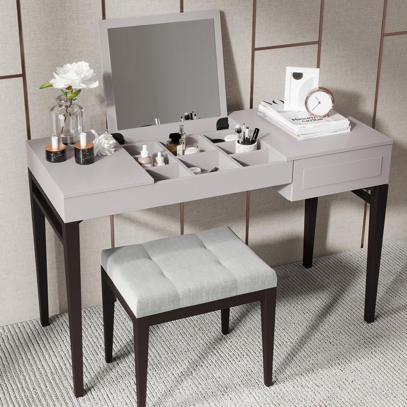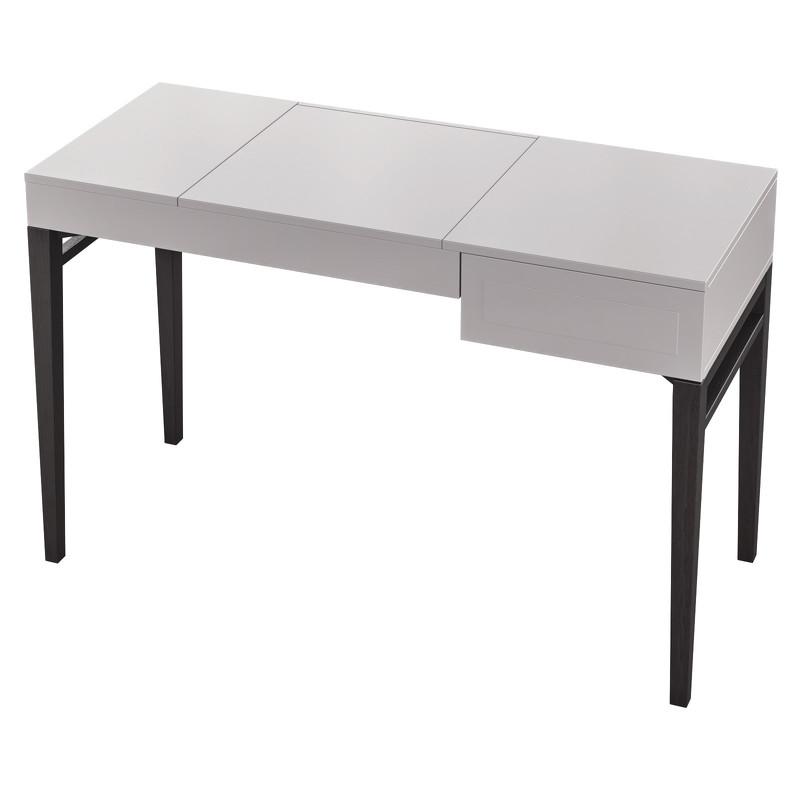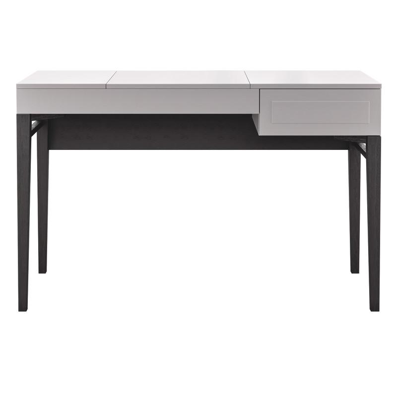Серый туалетный столик на высоких ножках из коллекции Marbella от бренда MOD Interiors. Модель дополнена ящиком и откидной крышкой для внутреннего отсека с зеркалом. Дизайнерская фрезеровка в лаконичном стиле выглядит очень стильно. Отделка фасадов — приятный серый матовый оттенок. 100% шпон ореха на высококачественной МДФ высокой плотности. Ножки из шпонированного массива березы — темно-коричневая (почти черная) древесина с натуральным рельефом. Внутри ящик оснащен системой легкого открывания push-to-open.
