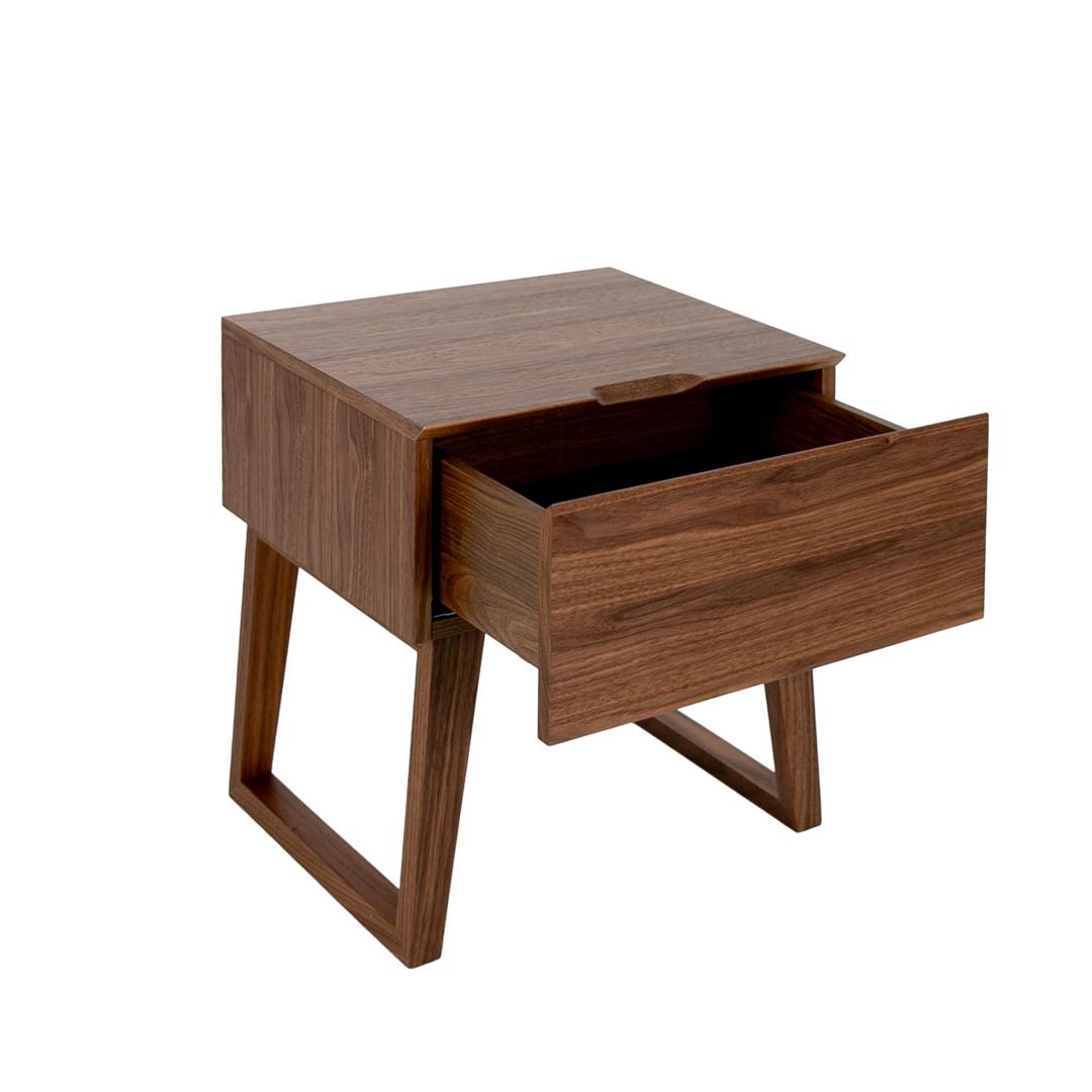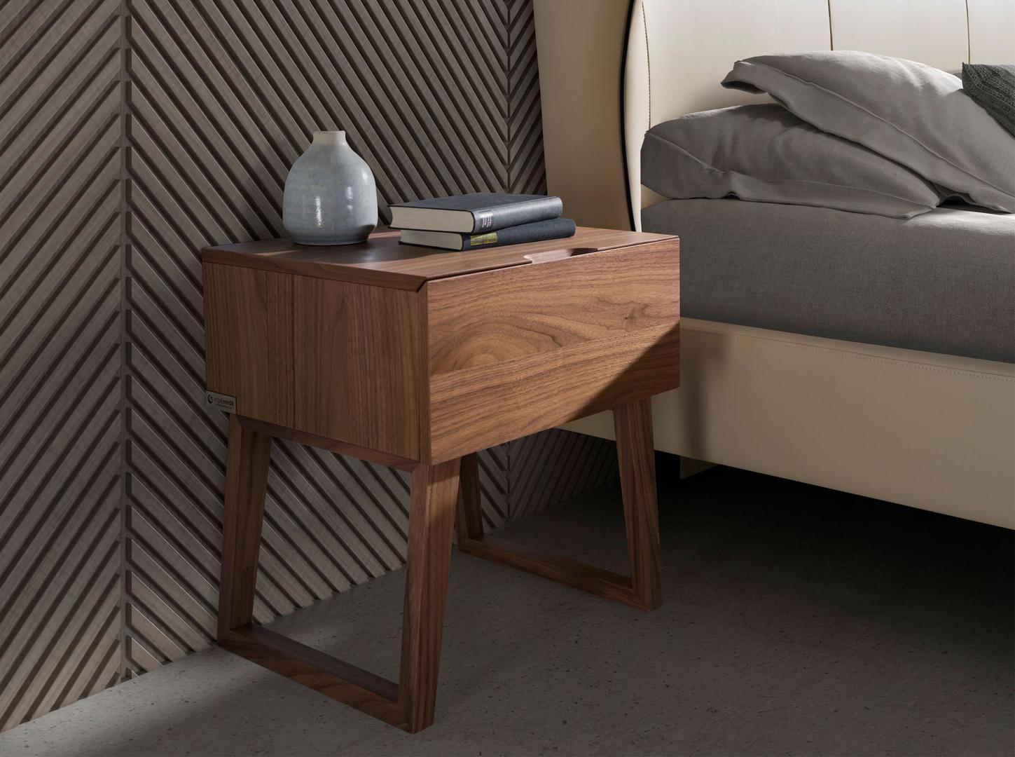 Прикроватная тумбочка CP 1702 -H — обязательный предмет интерьера для уюта в спальне от фабрики Angel Cerda. Тумбочка привлекает внимание своим нетипичным дизайном. Высокие ноги уж точно не ожидаешь увидеть в таком предмете интерьера. Поэтому для современного и стильного оформления спальной комнаты такой набор тумбочек безусловно подойдет лучшим образом. А универсальный древесный цвет позволит не менять ранее созданный интерьер. Тумбочка имеет традиционную прямоугольную форму. Передний фасад — это выдвижной ящик, у которого отсутствует ручка. Вместо нее дизайнеры сделали углубление вверху изделия. Ящик с доводчиком. Материал изготовления тумбочки — МДФ покрытый шпоном орехового дерева. Этот материал прочный и долговечный, эстетически привлекательный и современный. Ноги имеют рамочную конструкцию и образуют с основанием тумбочки тупой угол. Такое конструкционное решение смотрится оригинально и гарантирует изделию хорошую устойчивость, так как увеличивает площадь опоры. Тумбочка имеет следующие размеры: ширина — 45 см, высота — 40 см, глубина — 50 см. К комплекту прикроватных тумбочек можно приобрести из этой же коллекции буфет, женский столик, комод. Все изделия выдержаны в едином стиле, что, безусловно, создаст более полный интерьер.