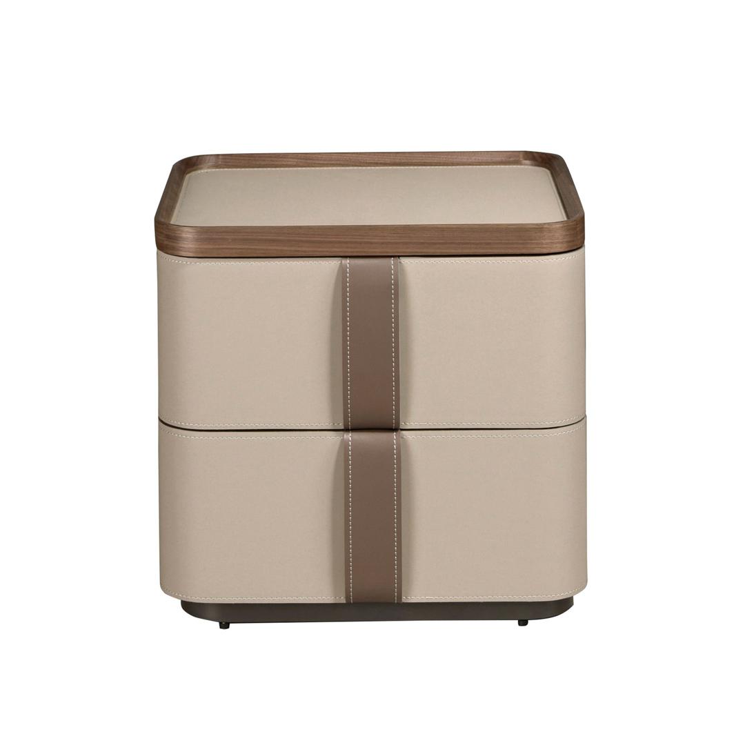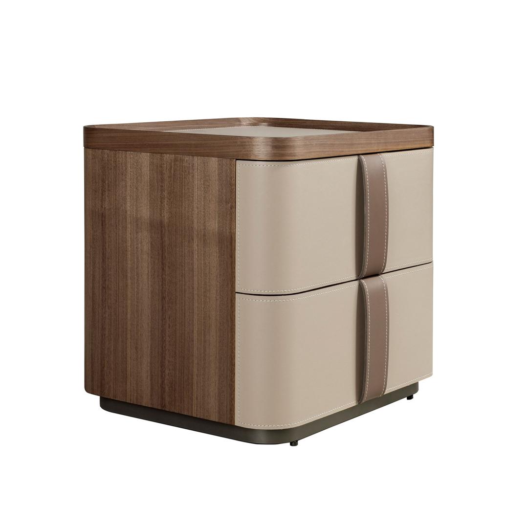 Современный дизайн прикроватной тумбочки с натуральной структурой из орехового шпона, обитой кожей цвета норки и оригинальной полированной нержавеющей стальной основой. Имеет большое пространство для хранения с 2 ящиками с системой открывания с помощью язычка и системой плавного закрывания.