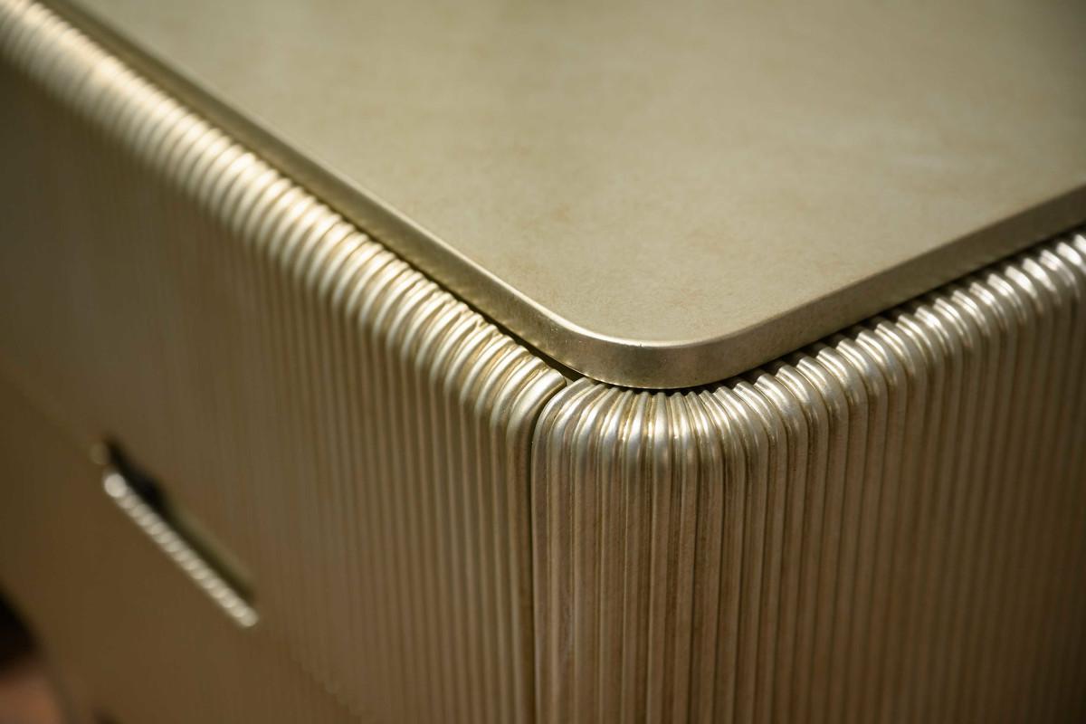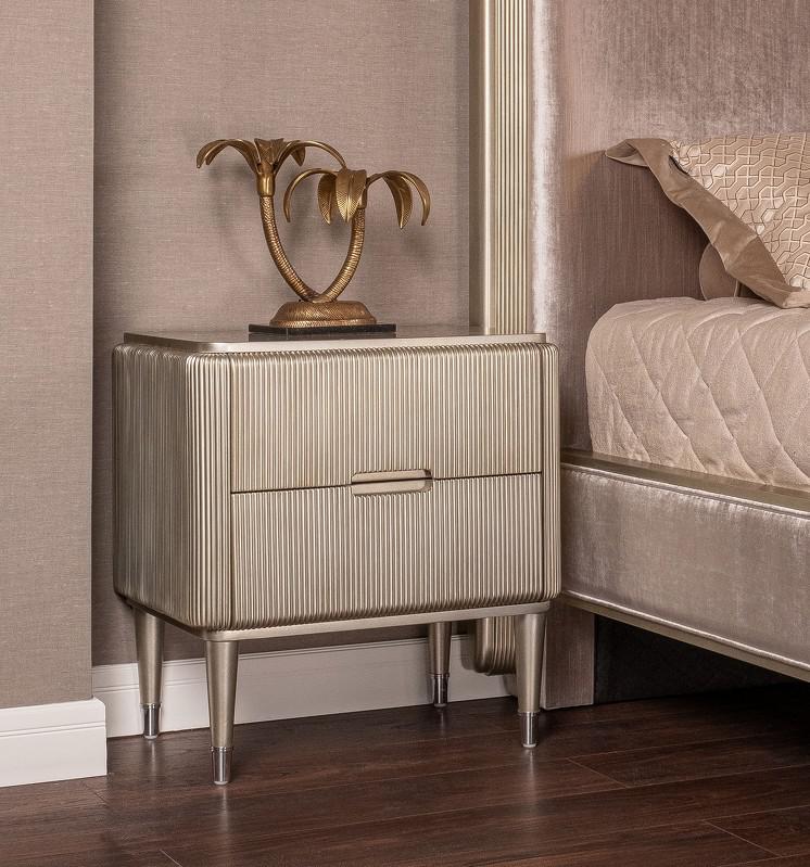 Прикроватная тумбочка от итальянского бренда Fratelli Barri. Закругленная форма и рифленые фасады выглядят очень актуально. Ножки прямые круглые, зауженные к низу. На ножках металлические колпачки. У тумбочки 2 ящика. Ручка - выемка на фасаде. Отделка - лак, цвет - патинированное серебро. Выполнена из массива дерева и высококачественного МДФ класса Е1. Цвет фурнитуры - хром. Ящики оснащены доводчиками для плавного закрывания. Дно ящиков декорировано черной бархатной тканью. Корпус ящиков - белого цвета. Данный предмет является частью коллекции Rimini. Вы можете оформить гостиную, столовую, спальню, кабинет и другие комнаты Вашего дома в едином стиле.