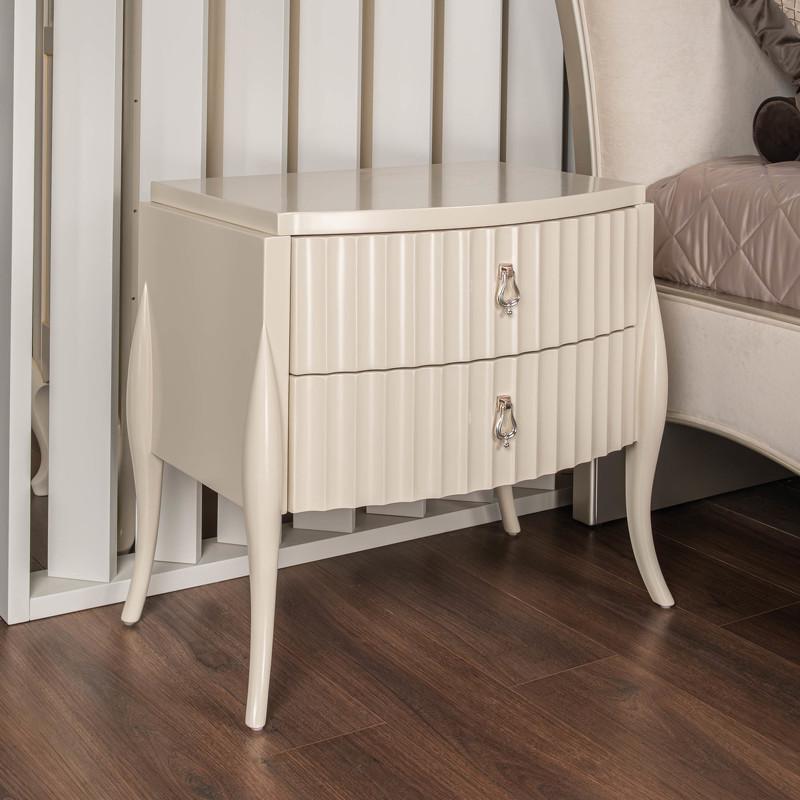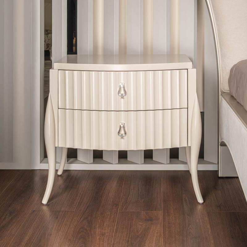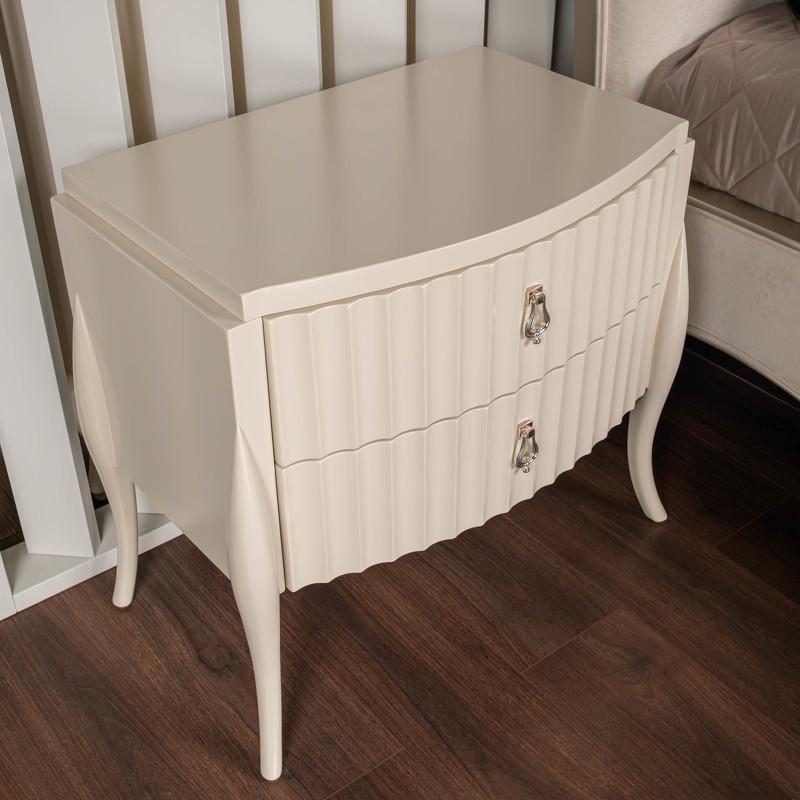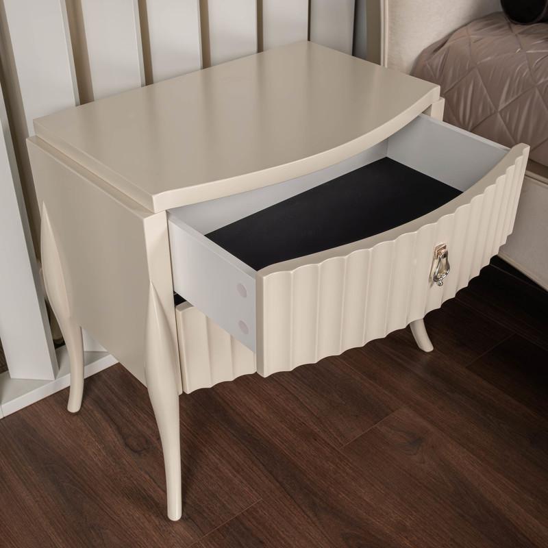 Элегантная прикроватная тумбочка от итальянского бренда Fratelli Barri имеет два вместительных ящика и стоит на высоких изогнутых ножках. Тумбочка в неоклассическом стиле. Рифленые фасады. Отделка - бежевый матовый лак. Выполнена из массива дерева и высококачественного МДФ класса Е1. Цвет фурнитуры - хром. Дно ящиков декорировано черной бархатной тканью. Ящики оснащены доводчиками для плавного закрывания. Корпус ящиков - белого цвета.