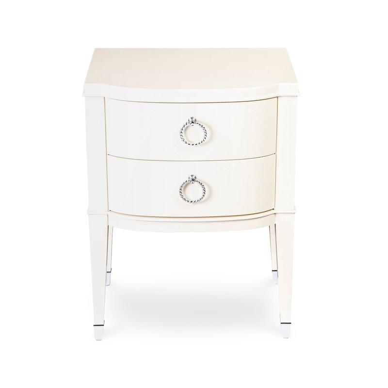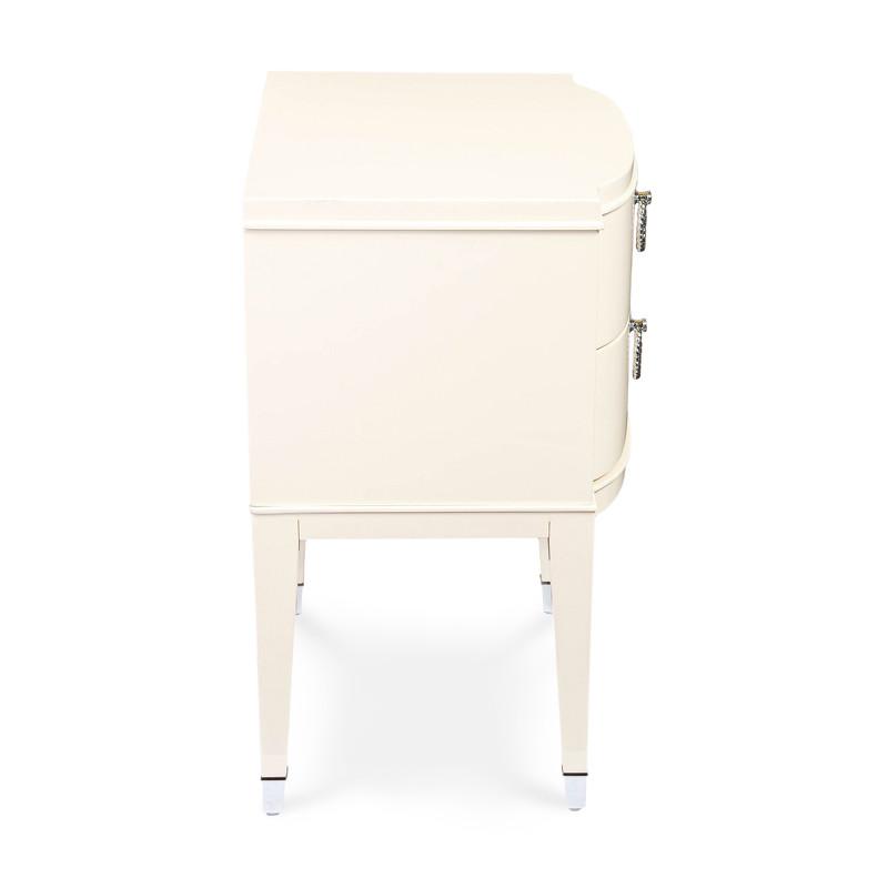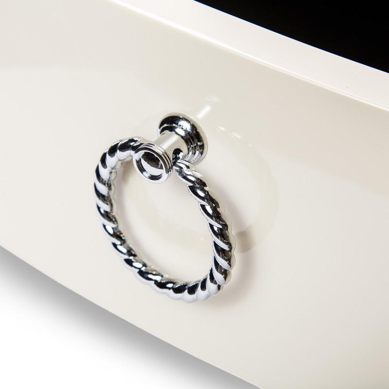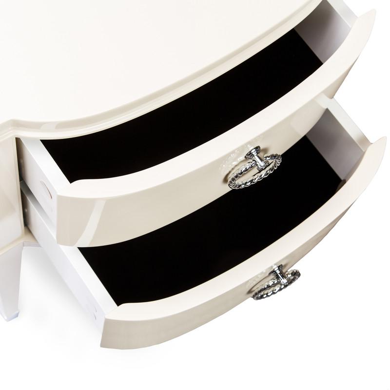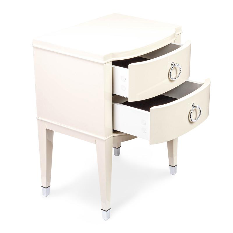 Изящная прикроватная тумбочка Modena от итальянского бренда Fratelli Barri. Тумбочка в неоклассическом стиле, с двумя выдвижными ящиками. Закругленные фасады. Отделка - бежевый блестящий лак. На ножках металлические колпачки. Выполнена из массива дерева и высококачественного МДФ класса Е1. Цвет фурнитуры - хром. Дно ящиков декорировано черной бархатной тканью. Ящики оснащены доводчиками для плавного закрывания. В данной коллекции есть более широкая тумбочка - 65 см.