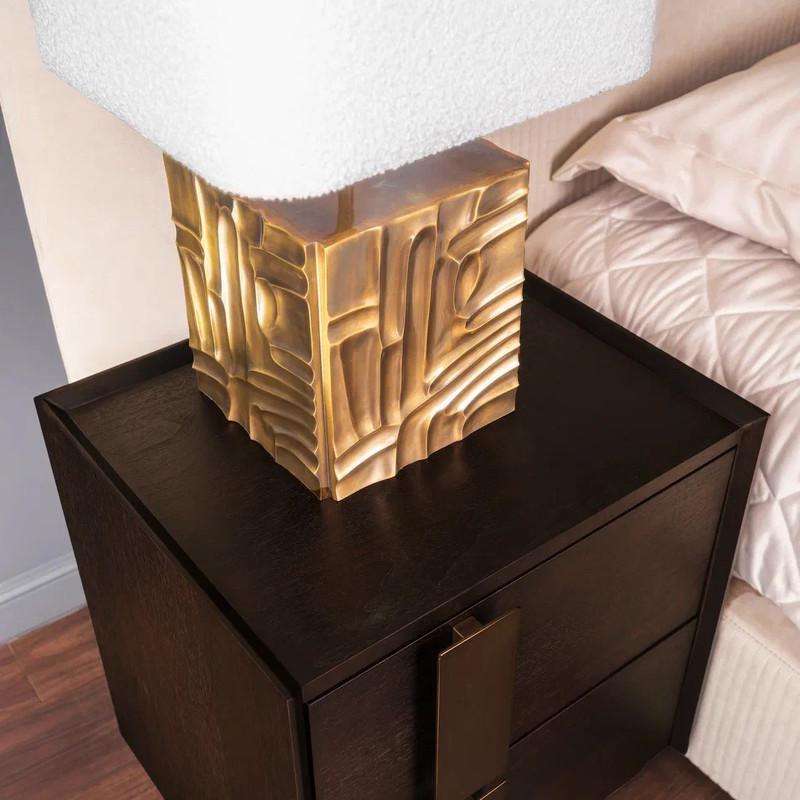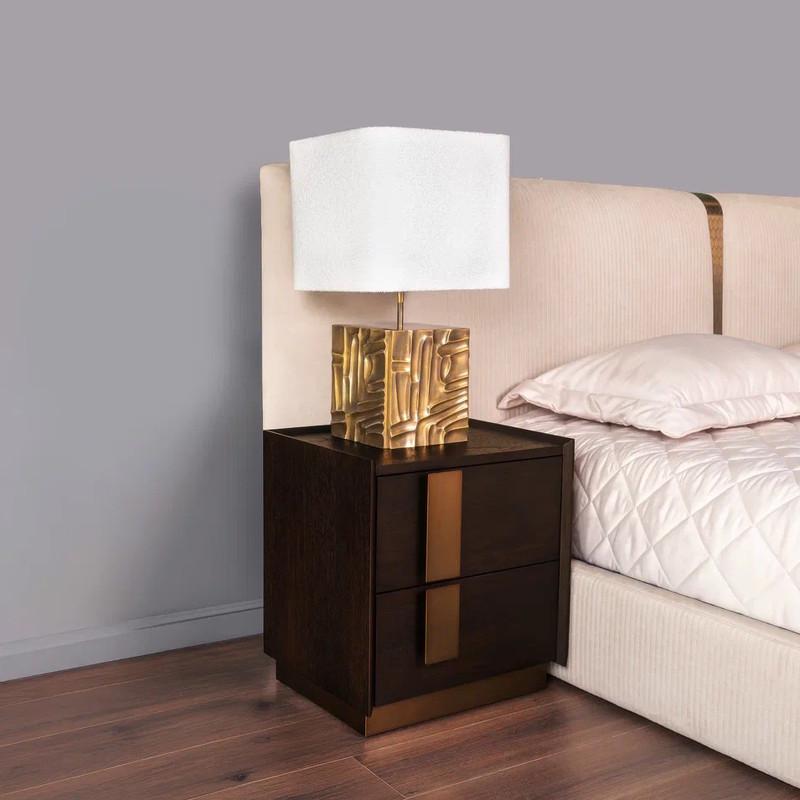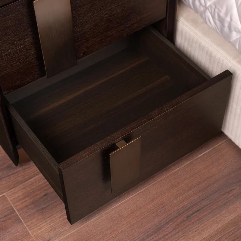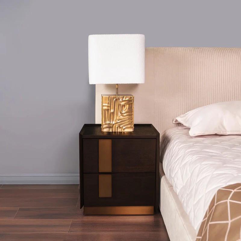 Прикроватная тумбочка от бренда Fratelli Barri. Тумбочка с ассиметричным декором. Вставка в цвете латунь добавляет элегантности и яркости предмету. Приподнятые края столешницы позволяют избежать падения предметов с тумбочки и добавляют еще большей декоративности. Тумбочка сделана из высококачественного МДФ. Отделка - натуральный шпон ореха тонированный в цвет горького шоколада. Вставки и цоколь выполнены из нержавеющей стали в цвете латунь. Два выдвижных ящика обеспечивают удобное хранение. Ящики оснащены скрытыми направляющими и системой плавного закрывания soft close. Данная тумбочка предназначена для расположения слева от кровати. В коллекции также есть тумбочка для размещения справа от кровати - ее артикул FB.BST.TER.19.