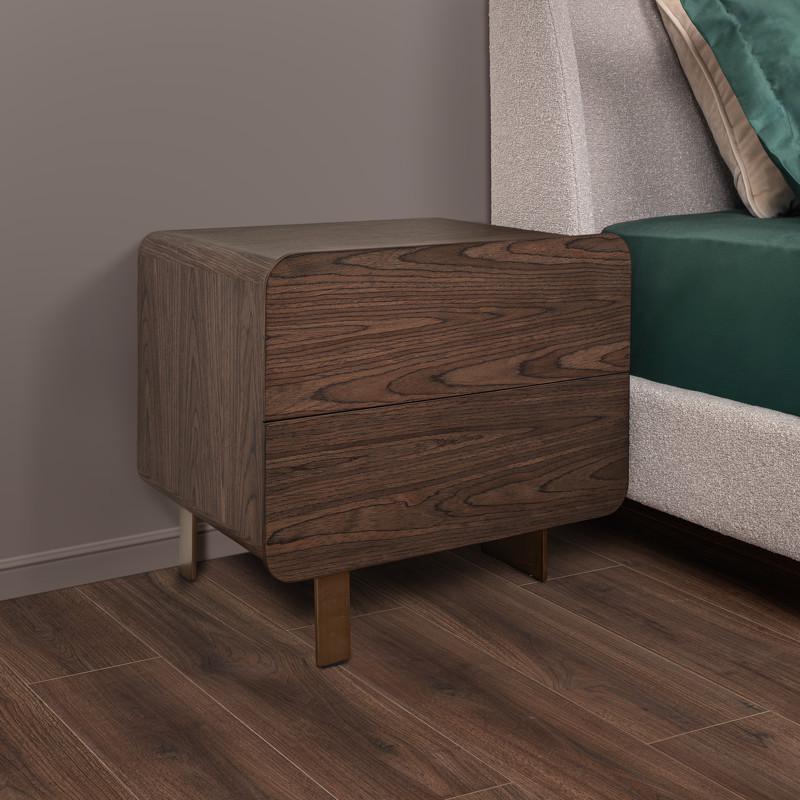 Прикроватная тумбочка от итальянского бренда Fratelli Barri. Тумба оснащена двумя выдвижными ящиками, благодаря им можно обеспечить удобное и организованное хранение. Ящики c плавным закрытием "soft close". Тумба изготовлена из высококачественного МДФ, ножки выполнены из нержавеющей стали в цвете бронза. Отделка корпуса выполнена в шпоне.