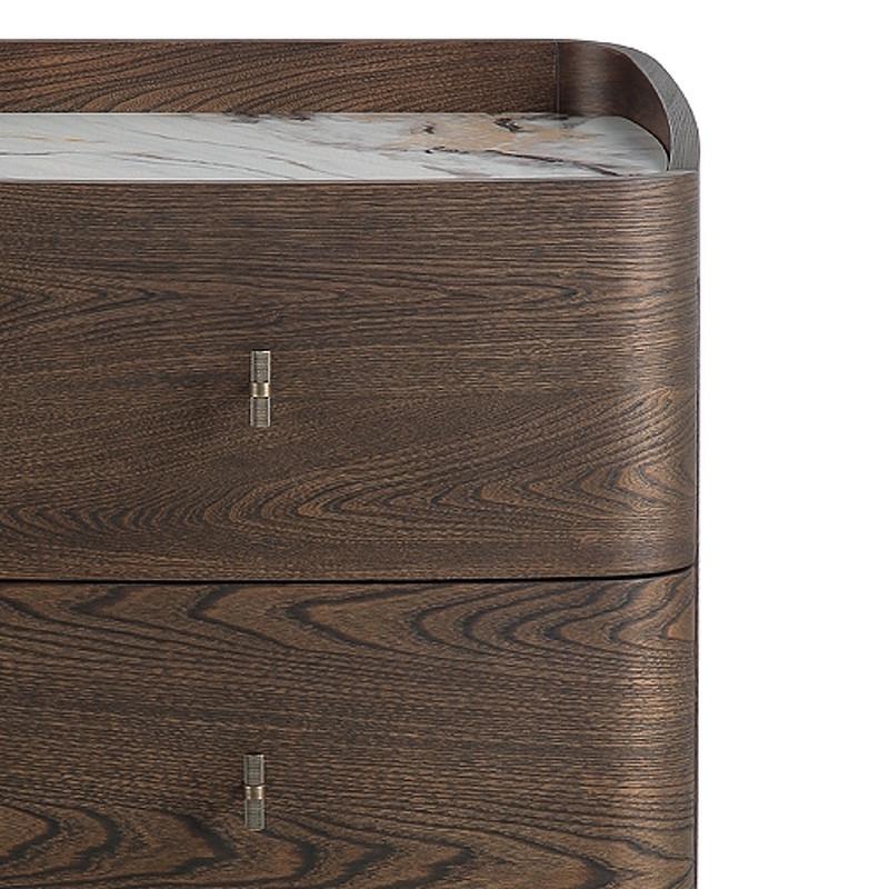Прикроватная тумбочка от итальянского бренда Fratelli Barri. Тумба оснащена двумя выдвижными ящиками, благодаря им можно обеспечить удобное и организованное хранение. Ящики c плавным закрытием "soft close". Тумба интересной закругленной формы, без острых углов, что делает ее атравматичной. Бортики по периметру керамической столешницы не дадут упасть мелким предметам. Основная отделка корпуса - натуральный шпон вяза.