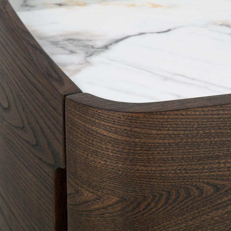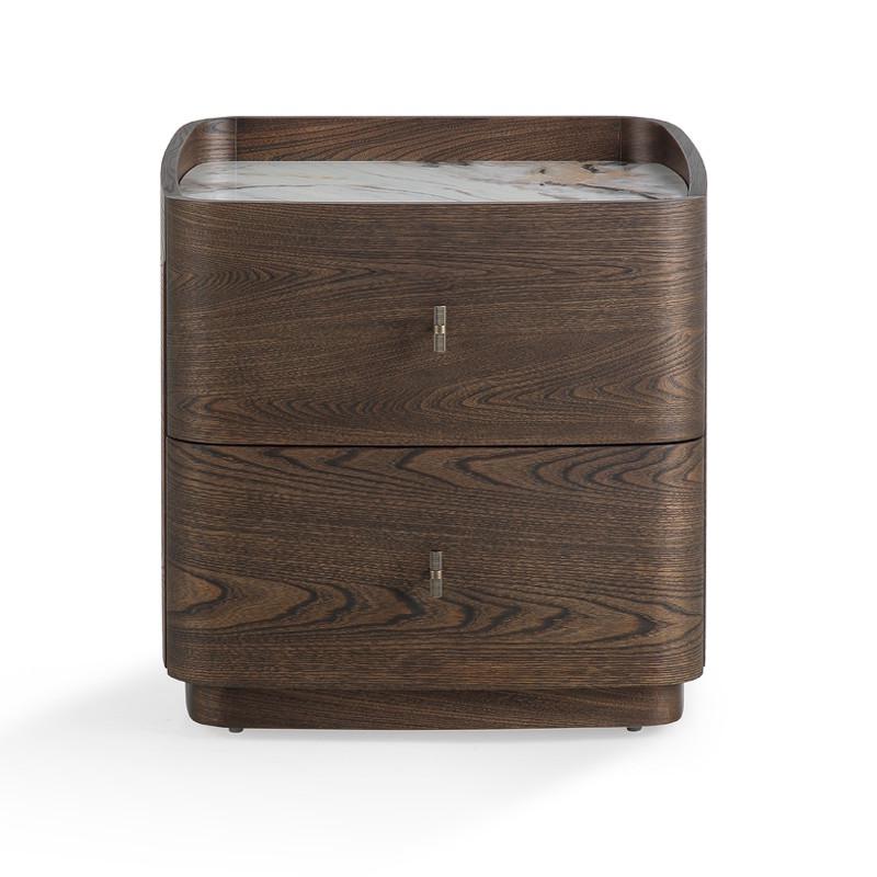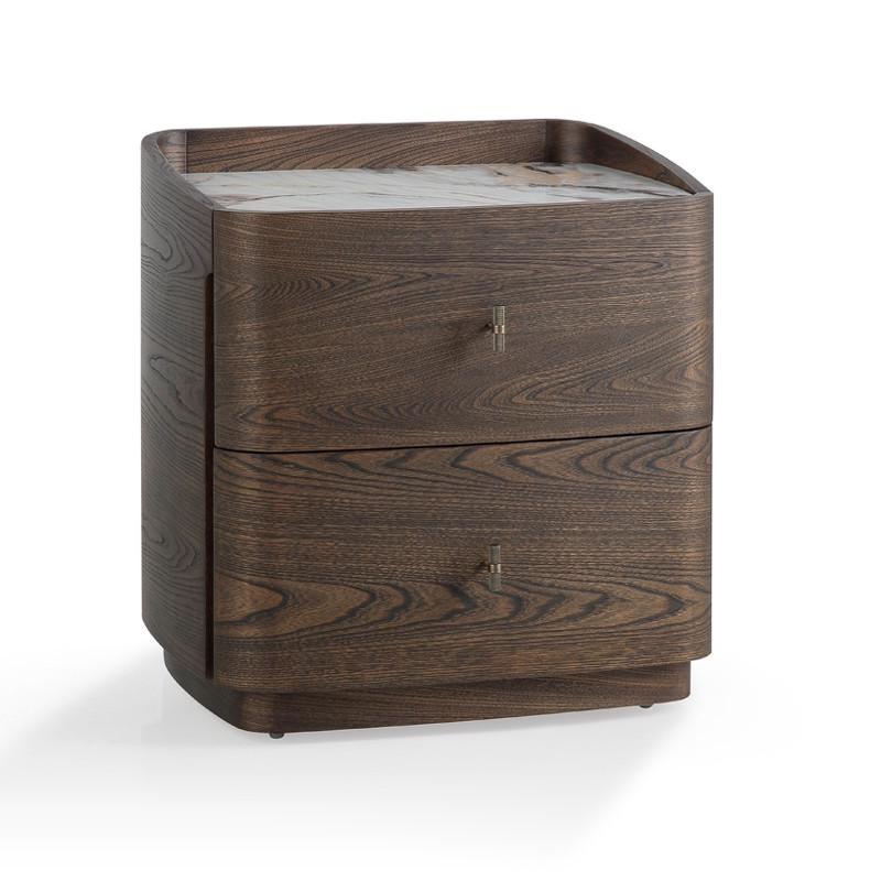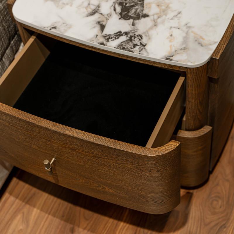 Прикроватная тумбочка от бренда Fratelli Barri. Тумба интересной закругленной формы, без острых углов, что делает ее аттравматичной. Бортики по периметру керамической столешницы не дадут упасть мелким предметам. Тумба выполнена из высококачественного МДФ. Отделка - натуральный шпон вяза, тонированный в теплый коричневый цвет. Столешница - керамика в бежевых тонах. Внутри ящиков покрытие меламин. Тумба оснащена двумя выдвижными ящиками, которые обеспечивают удобное и организованное хранение. Ящики cо скрытыми направляющими и системой плавного закрытием soft close. Дно верхнего ящика покрыто бархатной тканью. Обращаем внимание, что керамическая столешница имеет дизайн под мрамор и всегда неповторима, поэтому рисунок на столешнице может отличаться от фото на сайте.