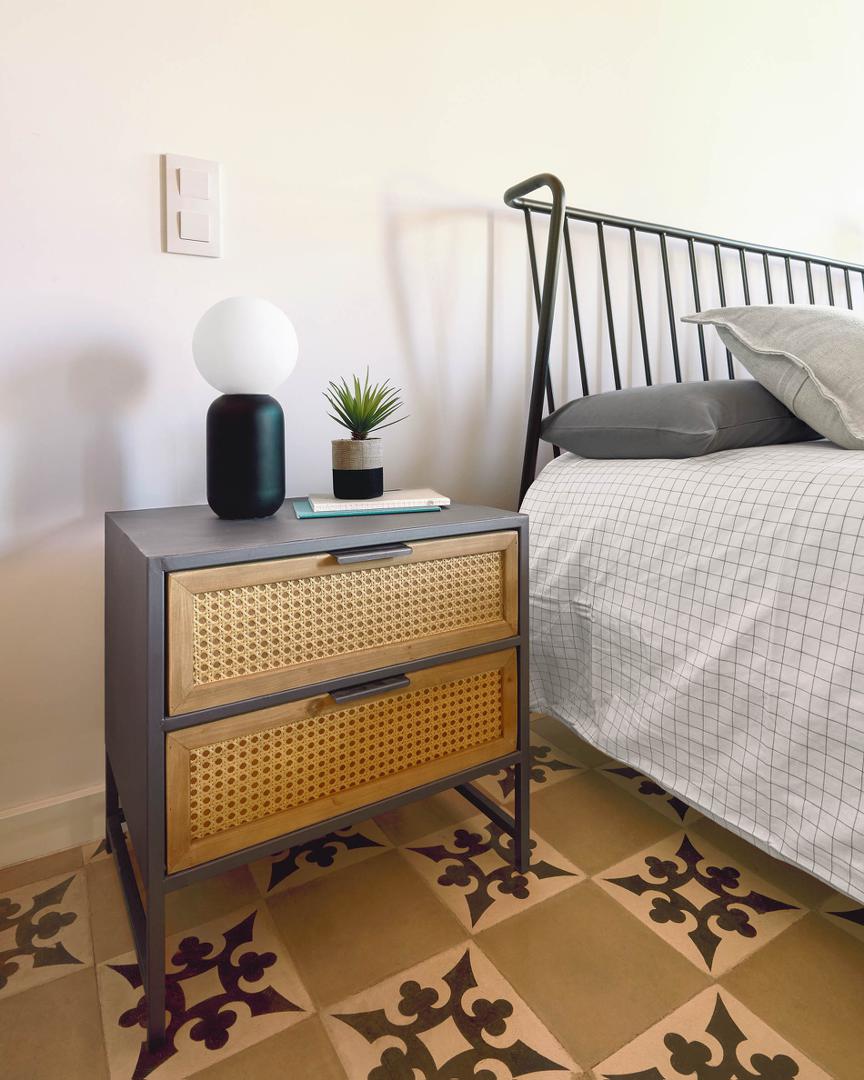 Прикроватная тумбочка Kyoko от фабрики La Forma (ex Julia Grup) – чудесные ротанговые дверцы и прочная металлическая основа. Прикроватная тумбочка Kyoko совершенно точно придаст аутентичные ноты вашей спальне. Ее колониальный стиль, созданный при помощи ротанга, объединен с промышленным минимализмом, выраженным в черной металлической конструкции. Такое объединение стилей выглядит оригинально и ярко, что безусловно будет плюсом для вашей обстановки. Если ищите свою уникальность, то вы ее точно нашли. Прикроватная тумбочка Kyoko состоит из металлической конструкции и двух деревянных ящиков. Ящики выдвижные, оснащены металлическими ручками и прочными направляющими. Внешняя отделка сделана из ротанга вручную. Поэтому каждая тумбочка обладает своей индивидуальностью. Металл окрашен в черный цвет матовой порошковой краской, которая защищает его от коррозии и механических повреждений. На ножках установлены пластиковые накладки, которые защищают напольное покрытие от повреждений. Максимальная нагрузка на каждый ящик не должна превышать 5 кг. Размеры: ширина – 50 см, высота – 50 см, глубина – 38 см. Вес изделия – 12,2 кг. Сборка не требуется.