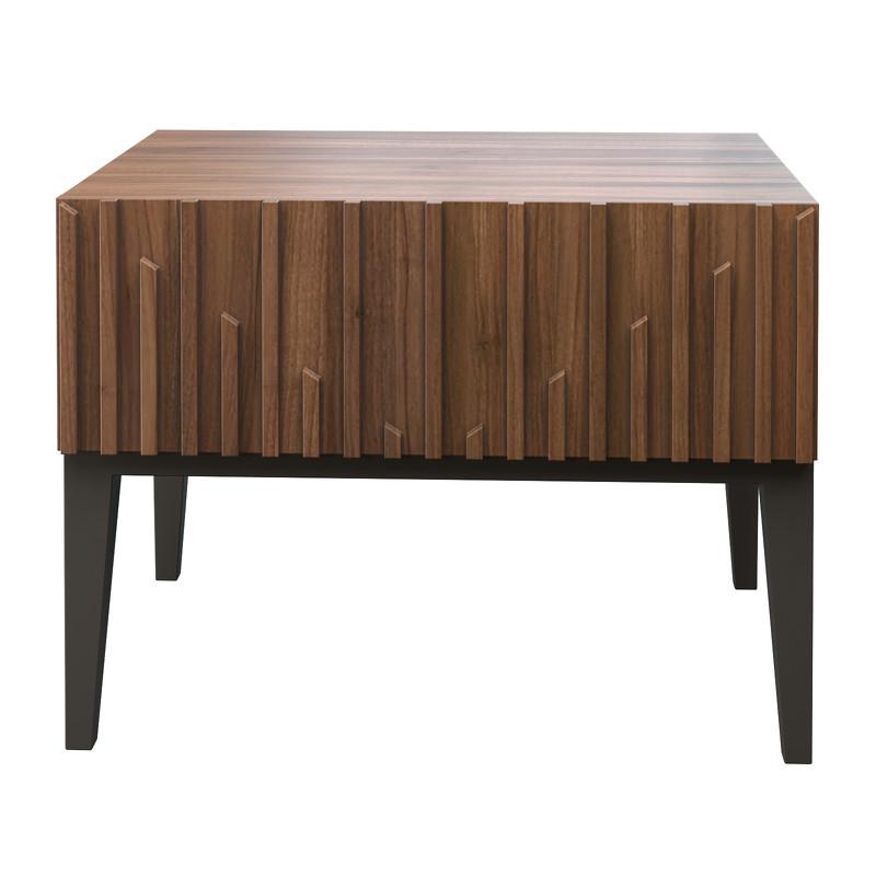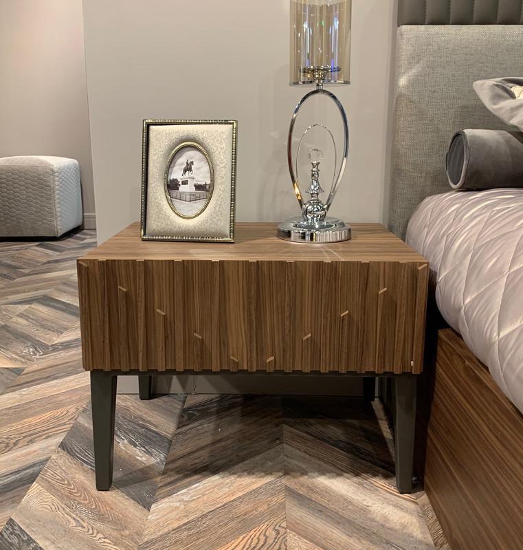 Прикроватная тумбочка от бренда Mod Interiors изготовлена из высококачественного, шпонированного МДФ высокой плотности, металлические ножки. Для производства металлических деталей используется высококачественный металл. Тумбочка оснащена выдвижным ящиком. Фасады декорированы симметричным реечным узором. Все ящики снабжены направляющими системы soft-close. Уникальная система последнего поколения добавляет невероятную плавность открывания/закрывания и высокую динамическую нагрузку.