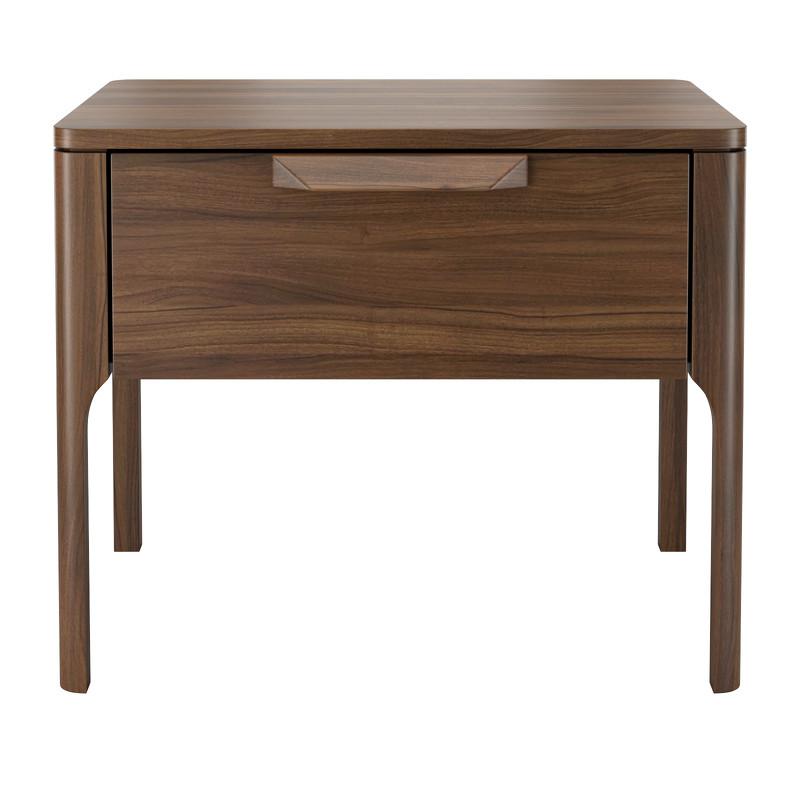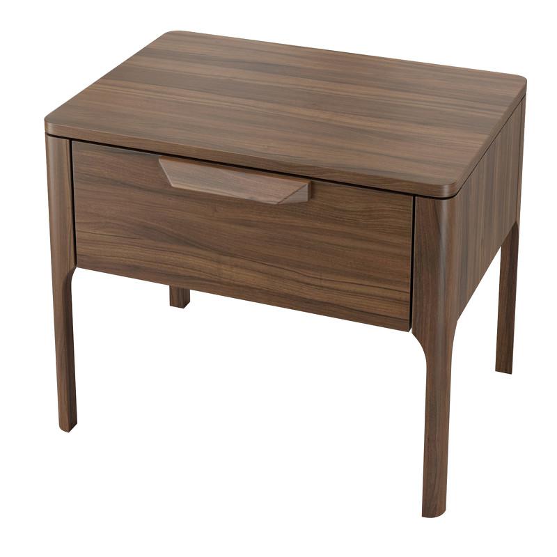 Прикроватная тумбочка RONDA от бренда MOD Interiors. Корпус изготовлен из высококачественного МДФ высокой плотности, ножки и ручка из массива дерева. Отделка - натуральный шпон американского ореха. Тумбочка в современном стиле, прекрасно дополнит интерьер спальни. Закругленные углы делают тумбочку максимально безопасной. У тумбочки 1 выдвижной ящик с направляющими системы soft-close. Уникальная система последнего поколения добавляет невероятную плавность открывания/закрывания. Высота фасадов ящика 17.9 см Высота ножек 25.6 см