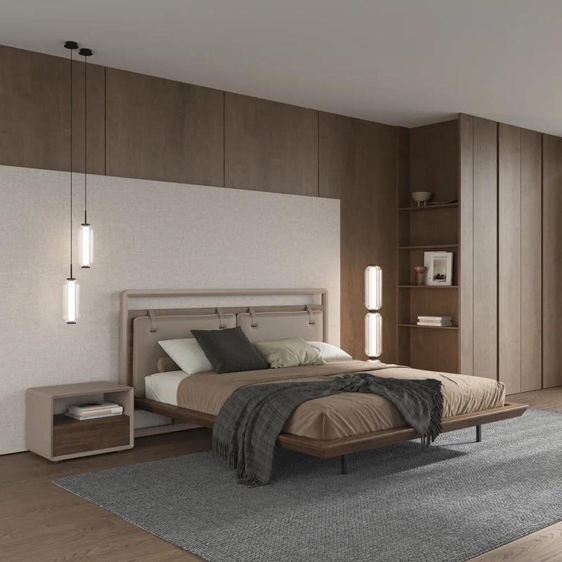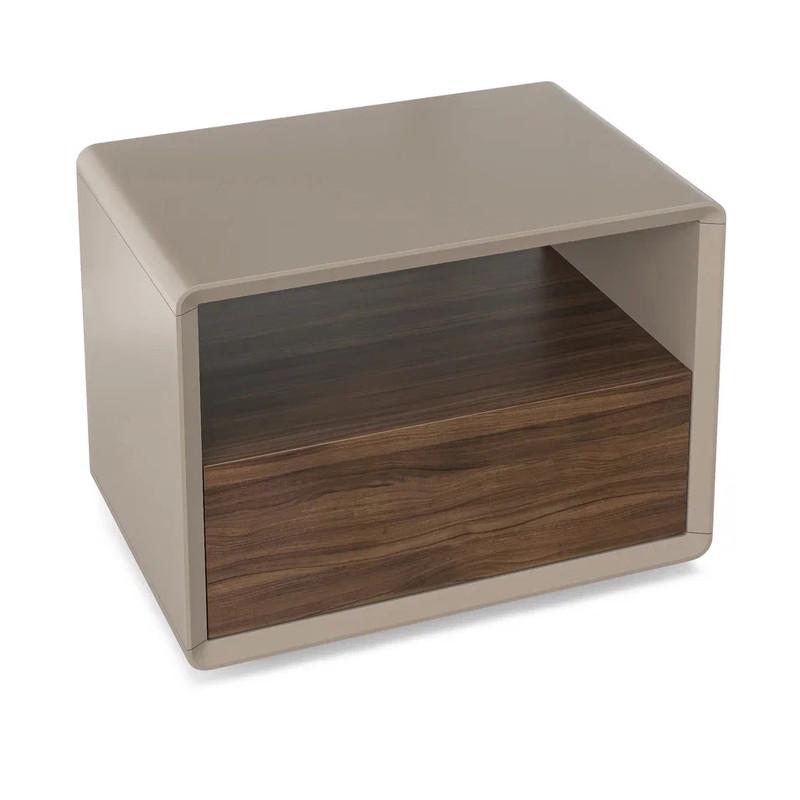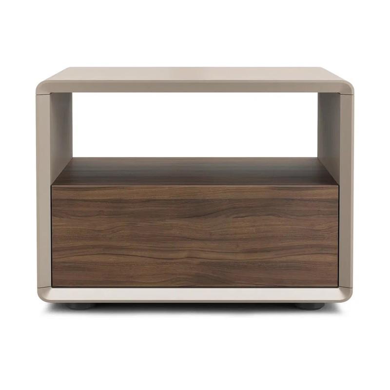 Прикроватная тумбочка Olimar от бренда MOD Interiors в современном стиле. Открытая ниша позволяет сделать тумбочку максимально удобной в использовании. Контрастная отделка делает этот предмет мебели очень акцентным в интерьере. Корпус и фасады выполнены из высококачественного МДФ класса Е1. Угловые элементы корпуса - массив дерева. Отделка - натуральный шпон американского ореха и матовый лак светло-бежевого цвета. Тумбочка с выдвижным ящиком со скрытыми направляющими и современной системой легкого открывания push-to-open (открывание нажатием). Тумбочка стоит на четырех пластиковых ножках черного цвета. Они углублены и практически незаметны.