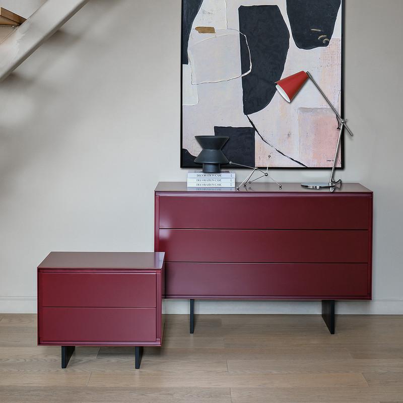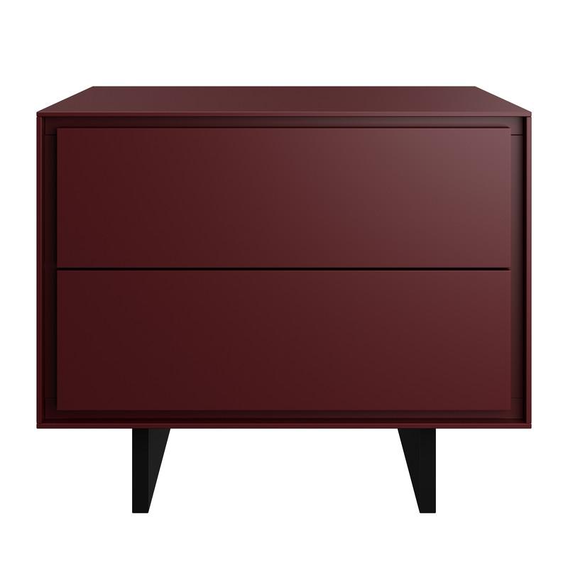 Акцентная прикроватная тумбочка Miramar в современном стиле на высоких ножках. Тумбочка выполнена из высококачественного, сертифицированного МДФ высокой плотности, в отделке - матовый лак роскошного винного оттенка. Ноги выполнены из метала и окрашены в черный матовый цвет. Тумбочка с двумя выдвижными ящиками со скрытыми направляющими и системой открывания Push to open (открывание нажатием). Высота ножек 12 см.