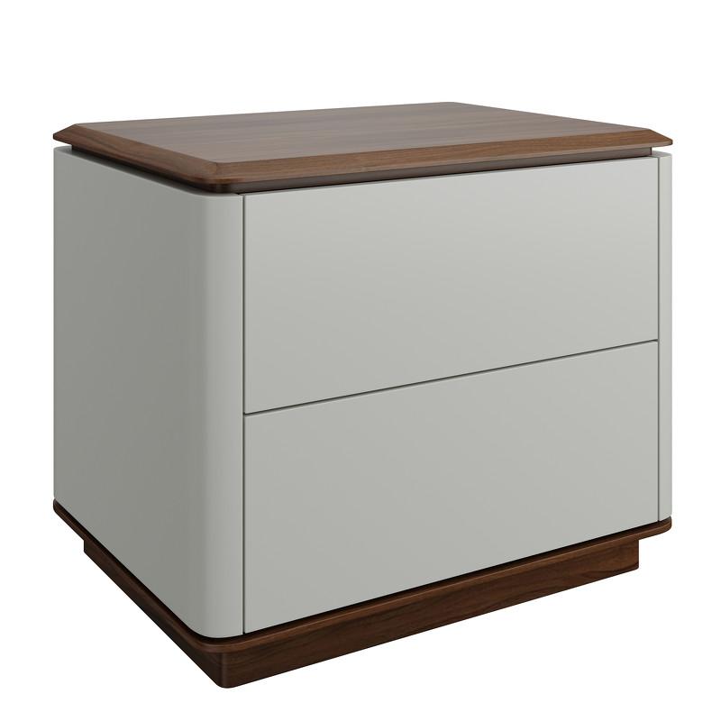 Прикроватная тумбочка с двумя ящиками из коллекции Altea от бренда MOD Interiors. Контрастность отделки придает этой модели яркости и свежести. А закругленные углы смягчают резкость прямых форм и делают мебель более безопасной и комфортной. Тумбочка выполнена из высококачественного МДФ высокой прочности. Отделка корпуса и фасадов - матовый лак приятного светло-серого оттенка. Отделка столешницы и базы - натуральный шпон ореха. Два ящика дополнены системой легкого открывания push-to-open (открывание нажатием без ручек). Фасады гладкие, без узора.