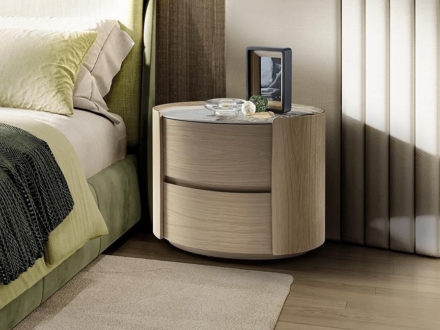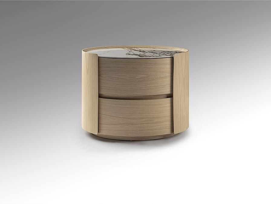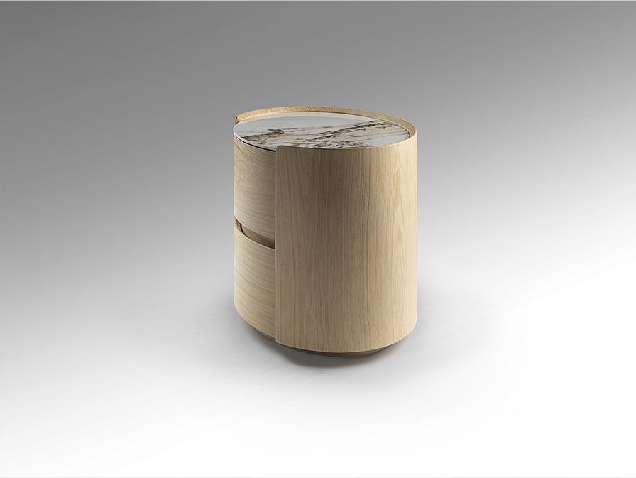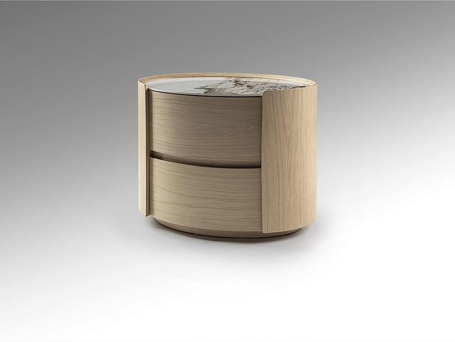 Овальный ночной столик с двумя ящиками на направляющих. Изготовлен из фанеры с отделкой под светлый дуб. Столешница из фарфора с отделкой под мрамор с прожилками.