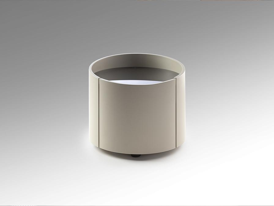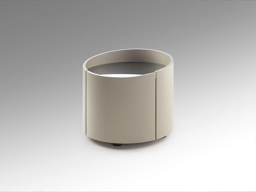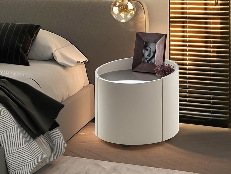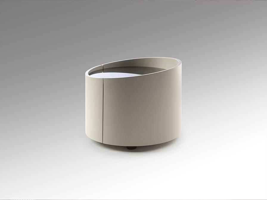 Круглый ночной столик с двумя ящиками на направляющих. Изготовлен из фанеры цвета светло-хаки. Столешница из дымчатого стекла.