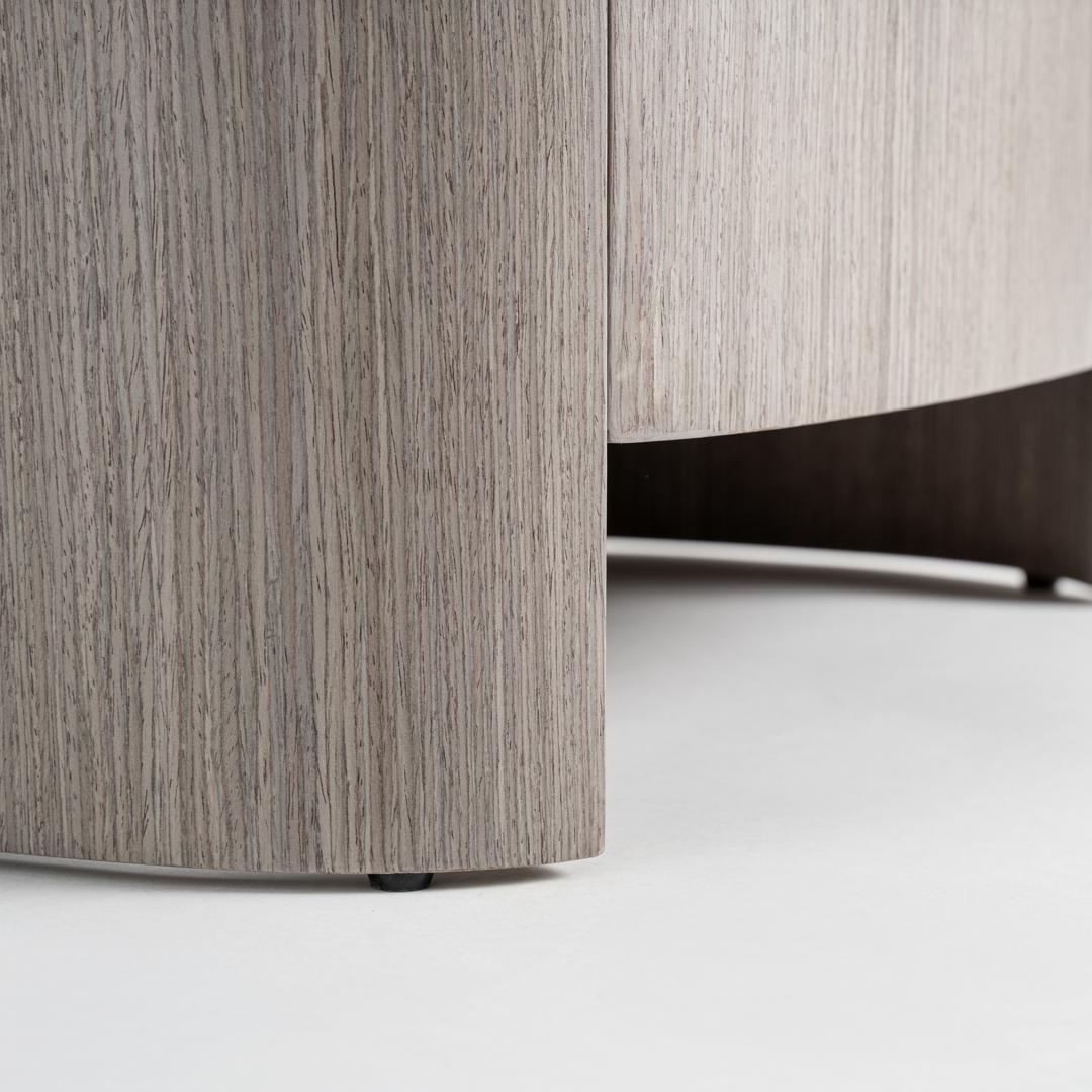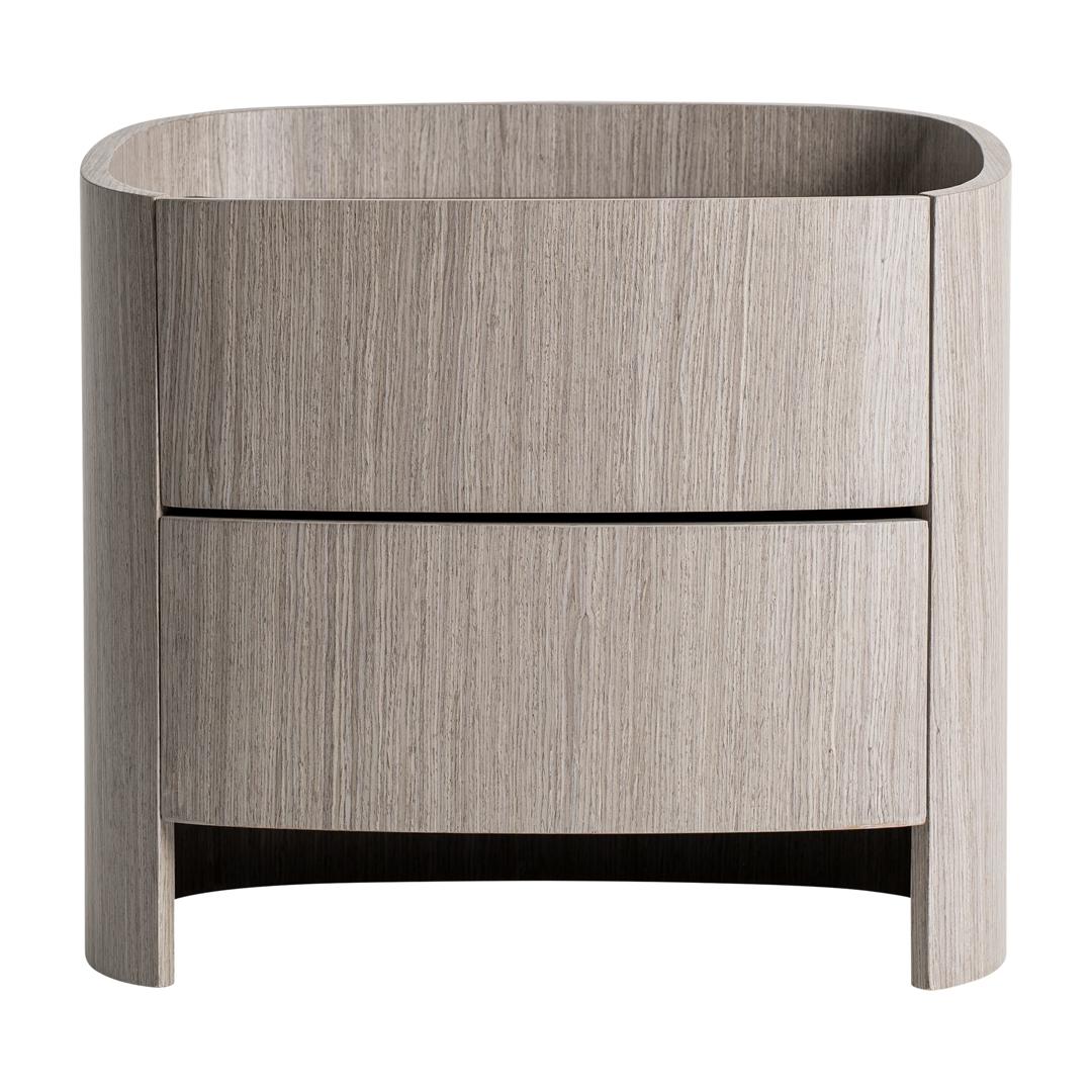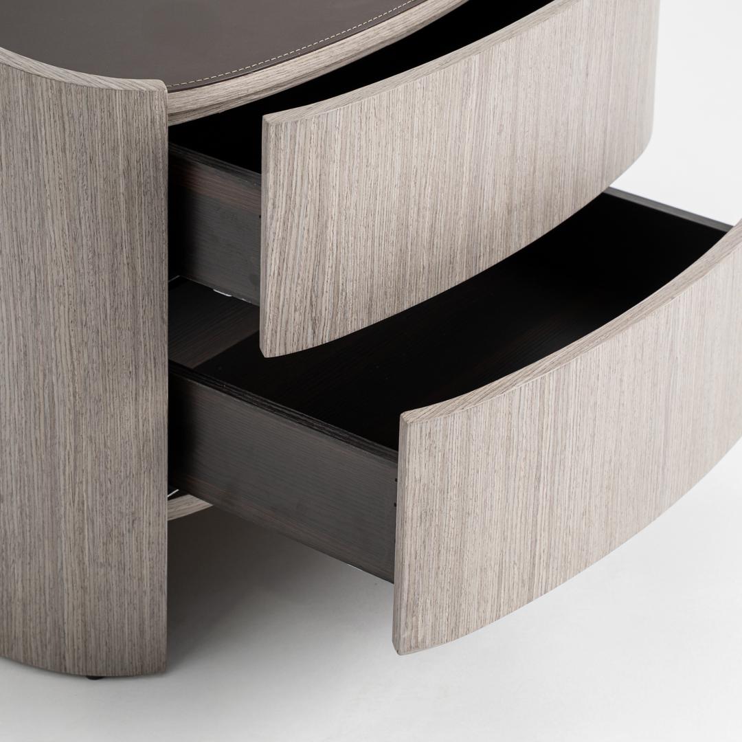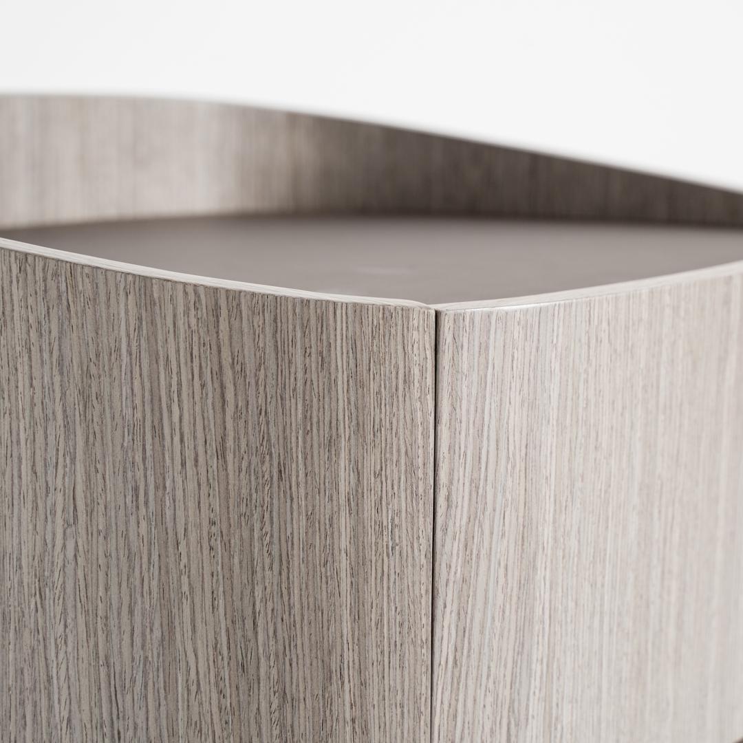 Прикроватная тумбочка в современном стиле Буркина-Фасо, изготовленная из серой фанеры в сочетании с серым дубовым шпоном и серой кожей. Ширина: 55 см, Глубина: 42 см, Высота: 50 см