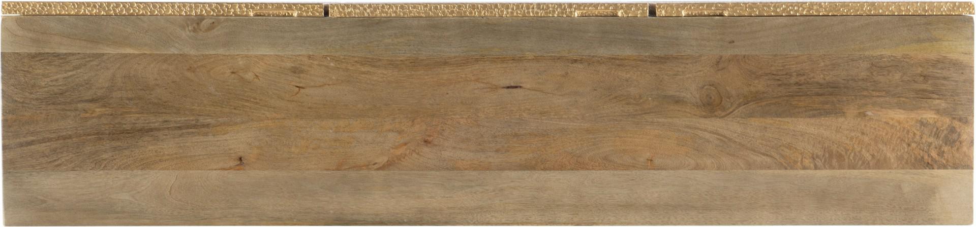 Большой и весьма вместительный комод может служить еще в качестве тумбы под телевизор. Комод выполнен в переходном стиле и изготовлен из дерева манго с использованием латунной фольги для декора дверок.